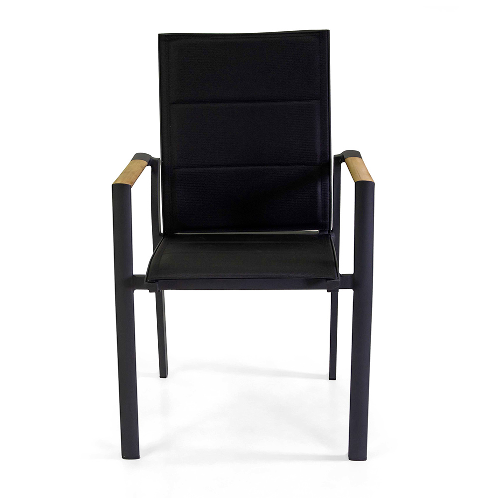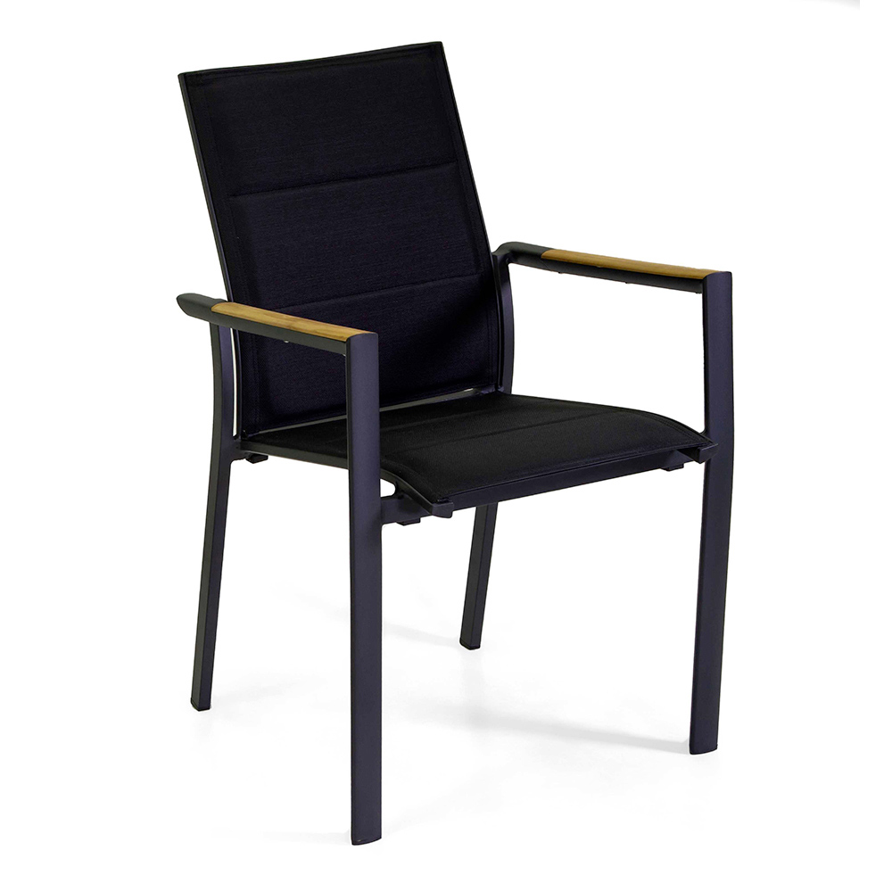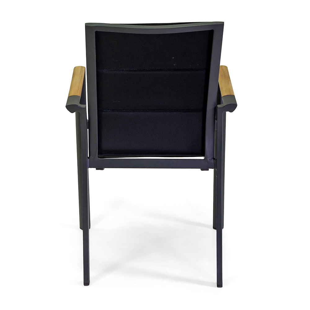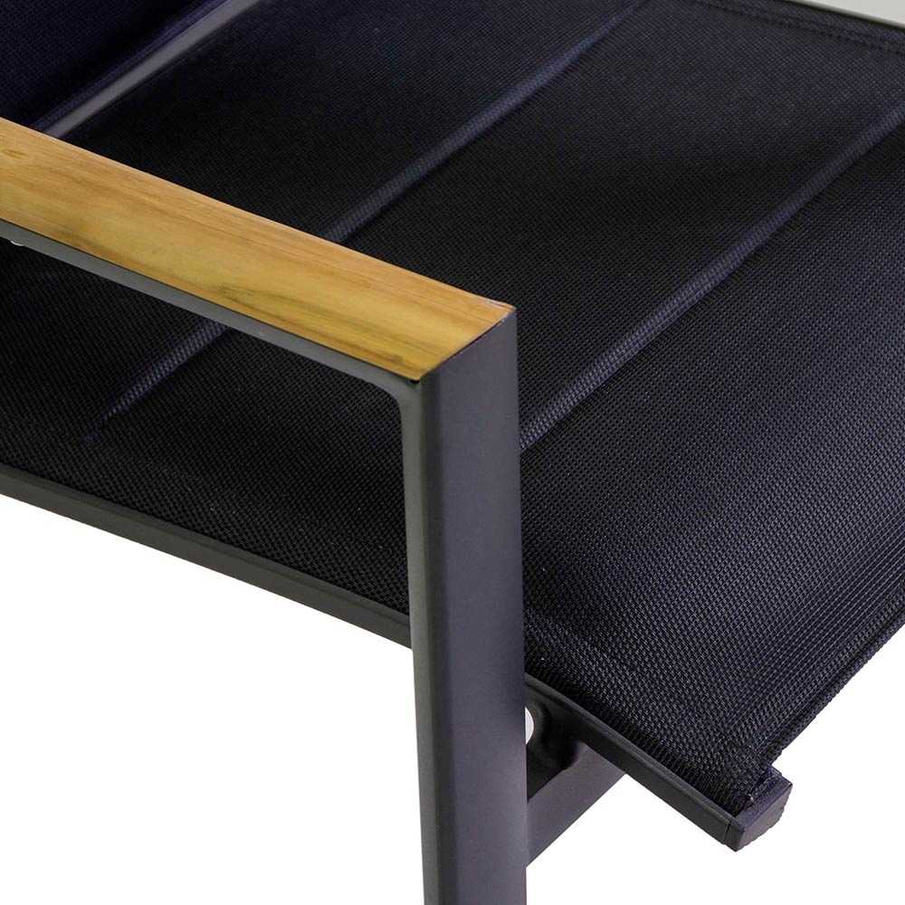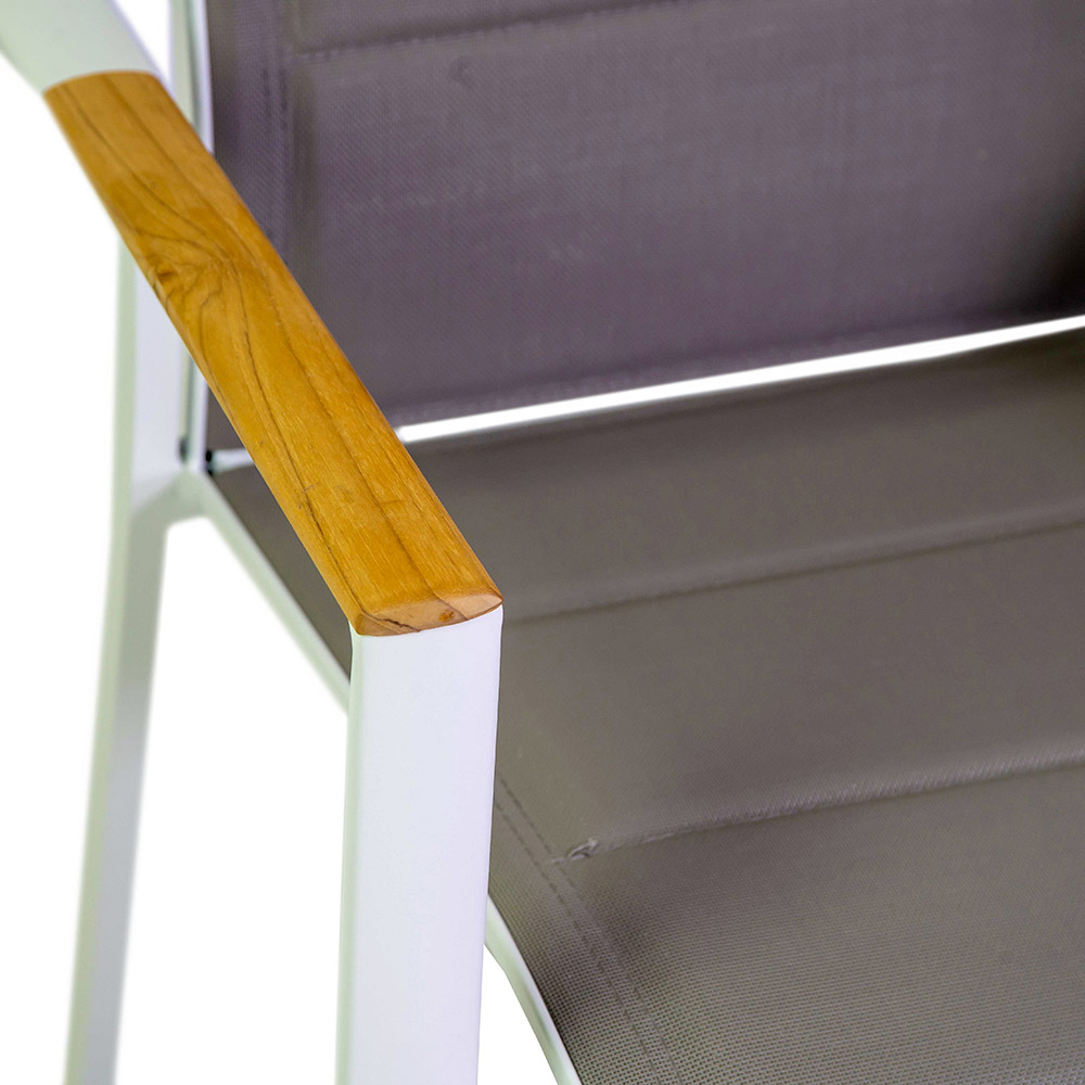 Acentos de madeira de teca nos braços adicionam um toque de calor natural e estilo refinado, tornando esta cadeira perfeita para ambientes casuais e elegantes.