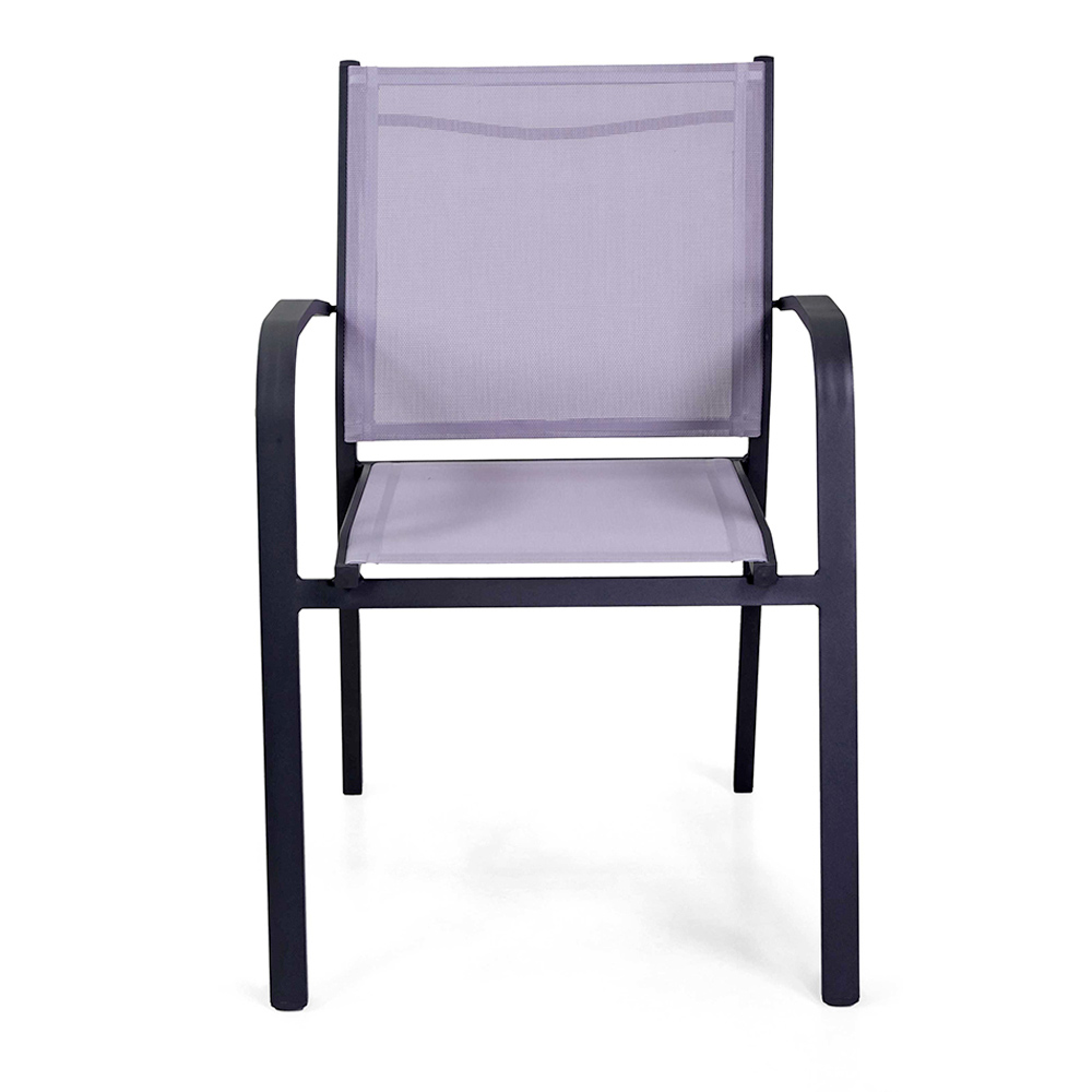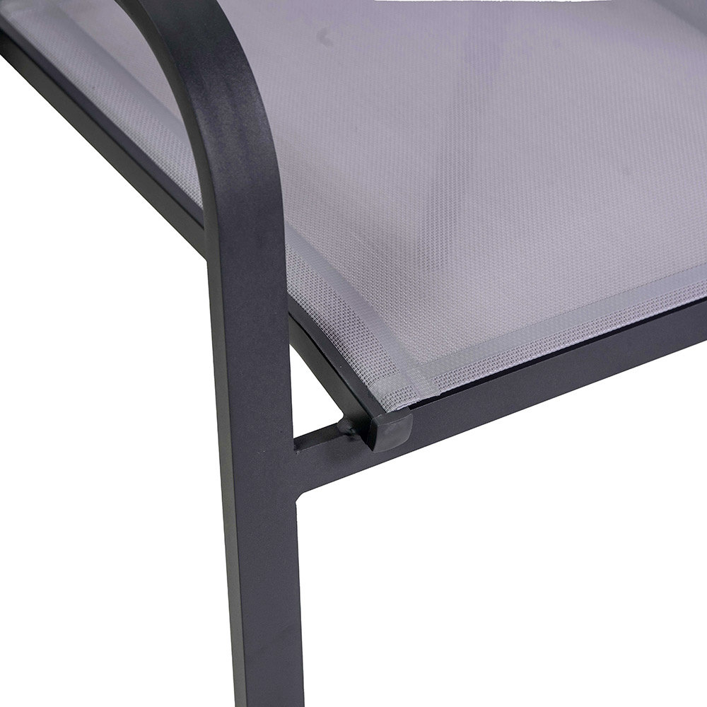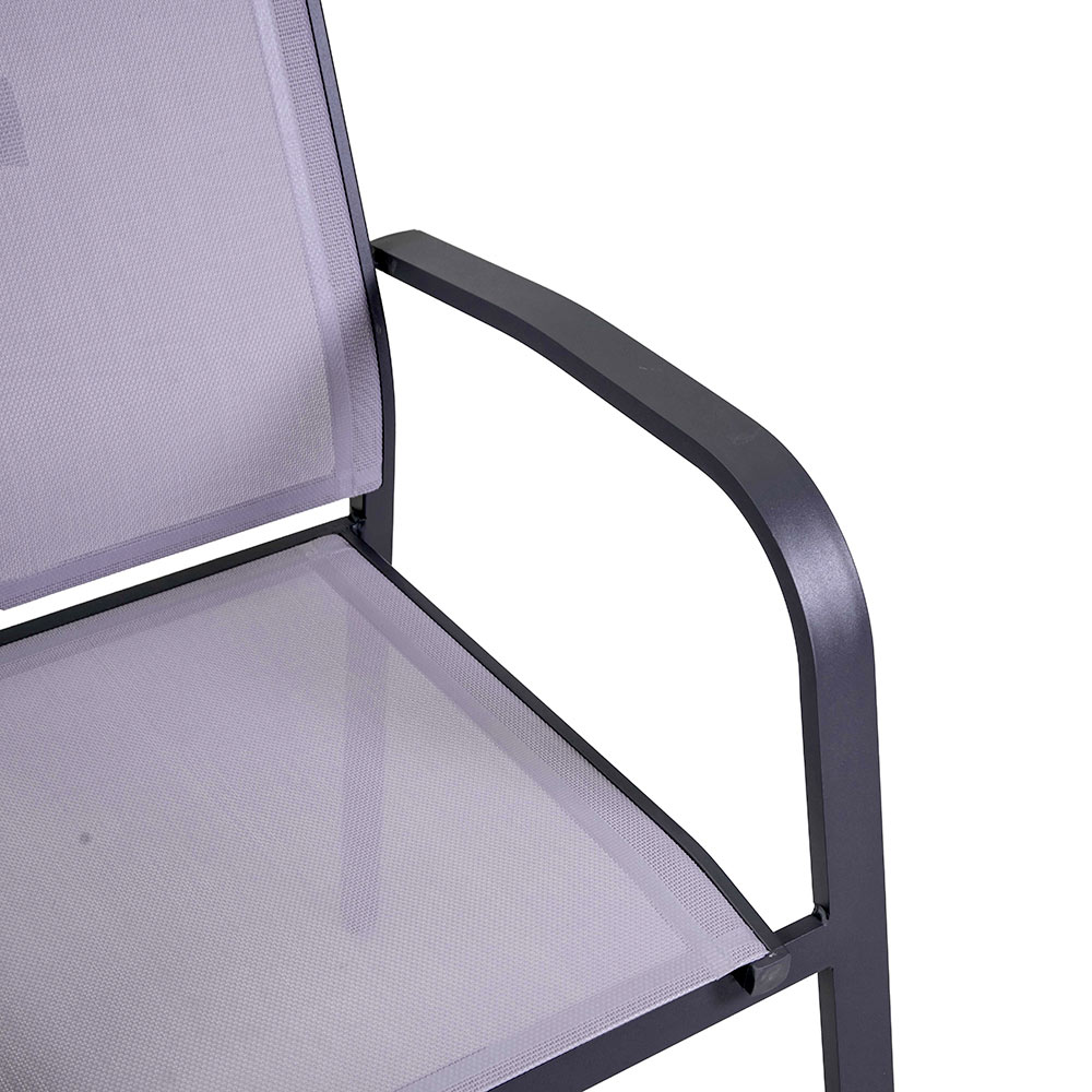 Esta cadeira com estrutura de alumínio revestido a pó antracite representa o equilíbrio ideal entre funcionalidade e estilo, perfeito para ambientes ao ar livre, como jardins e terraços. O textilene cinza não só lhe confere uma aparência moderna e elegante, mas também garante um assento confortável e resistente às intempéries.
