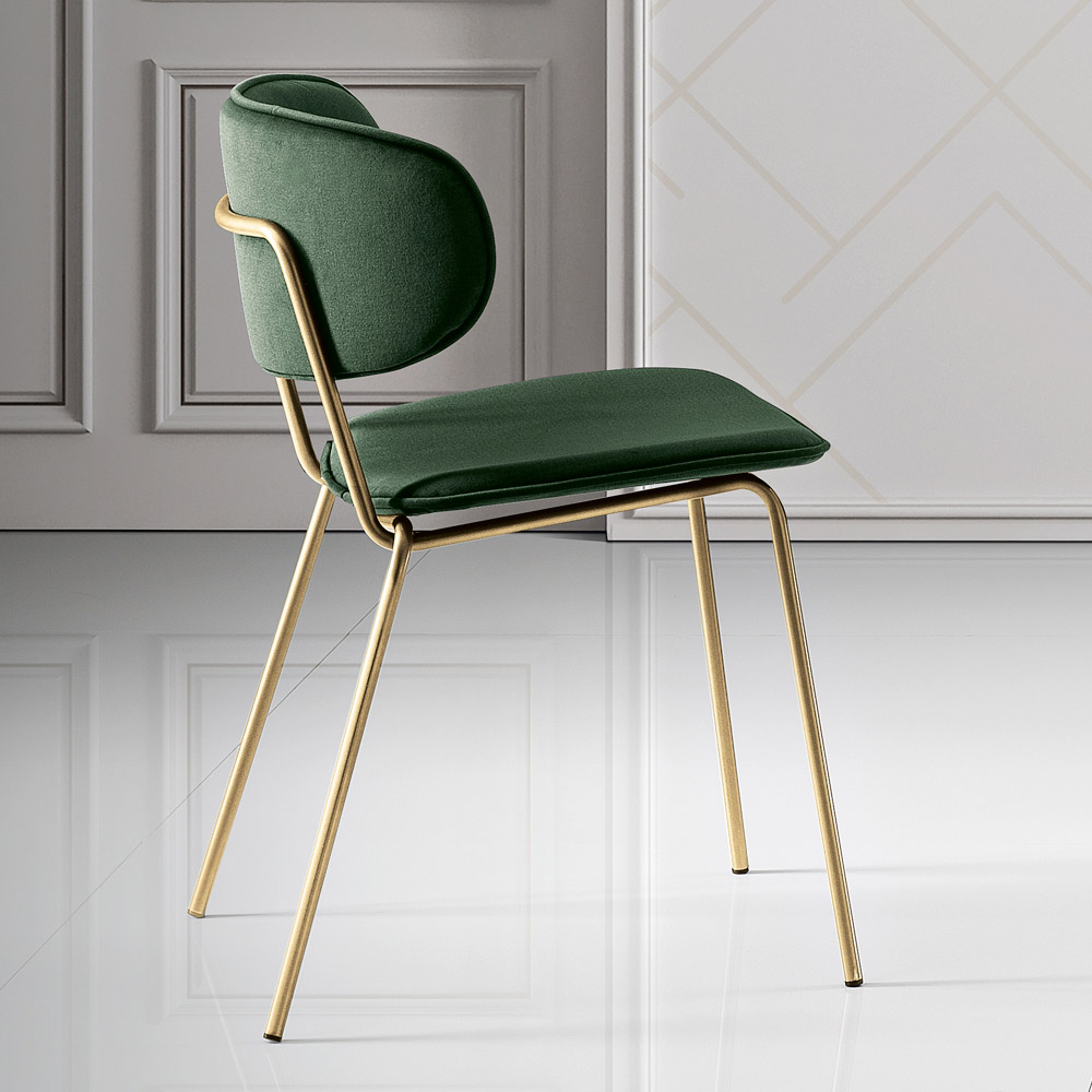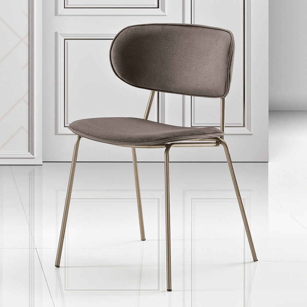 Esta cadeira é uma joia do design, perfeita para quem quer aliar funcionalidade e estilo. O assento e o encosto curvo são revestidos em tecido, oferecendo uma experiência de assento confortável e elegante. A silhueta simples mas sofisticada da cadeira é acentuada pelas pernas metálicas , que acrescentam um toque de aconchego moderno e uma sensação de leveza visual.