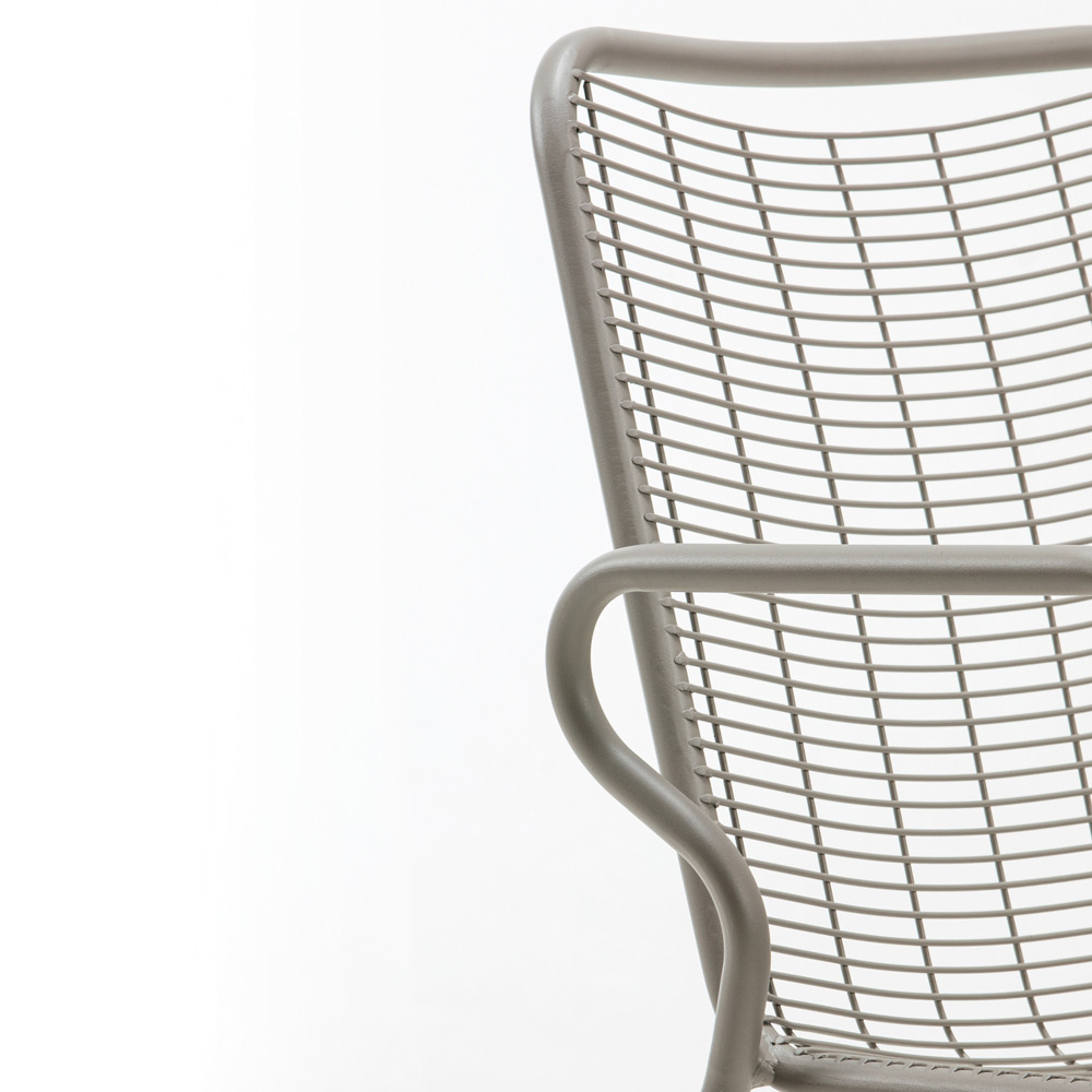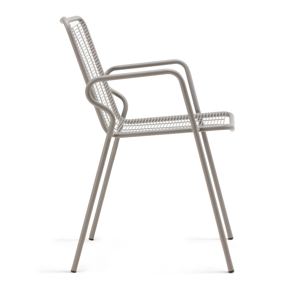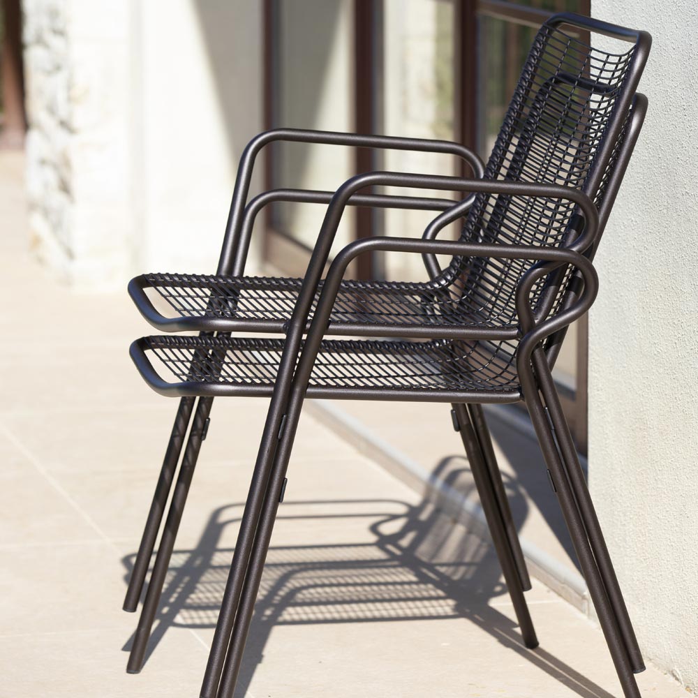 Cadeira empilhável para área externa em ferro galvanizado com revestimento em pó e braços. Fabricado na Itália, 2 peças.