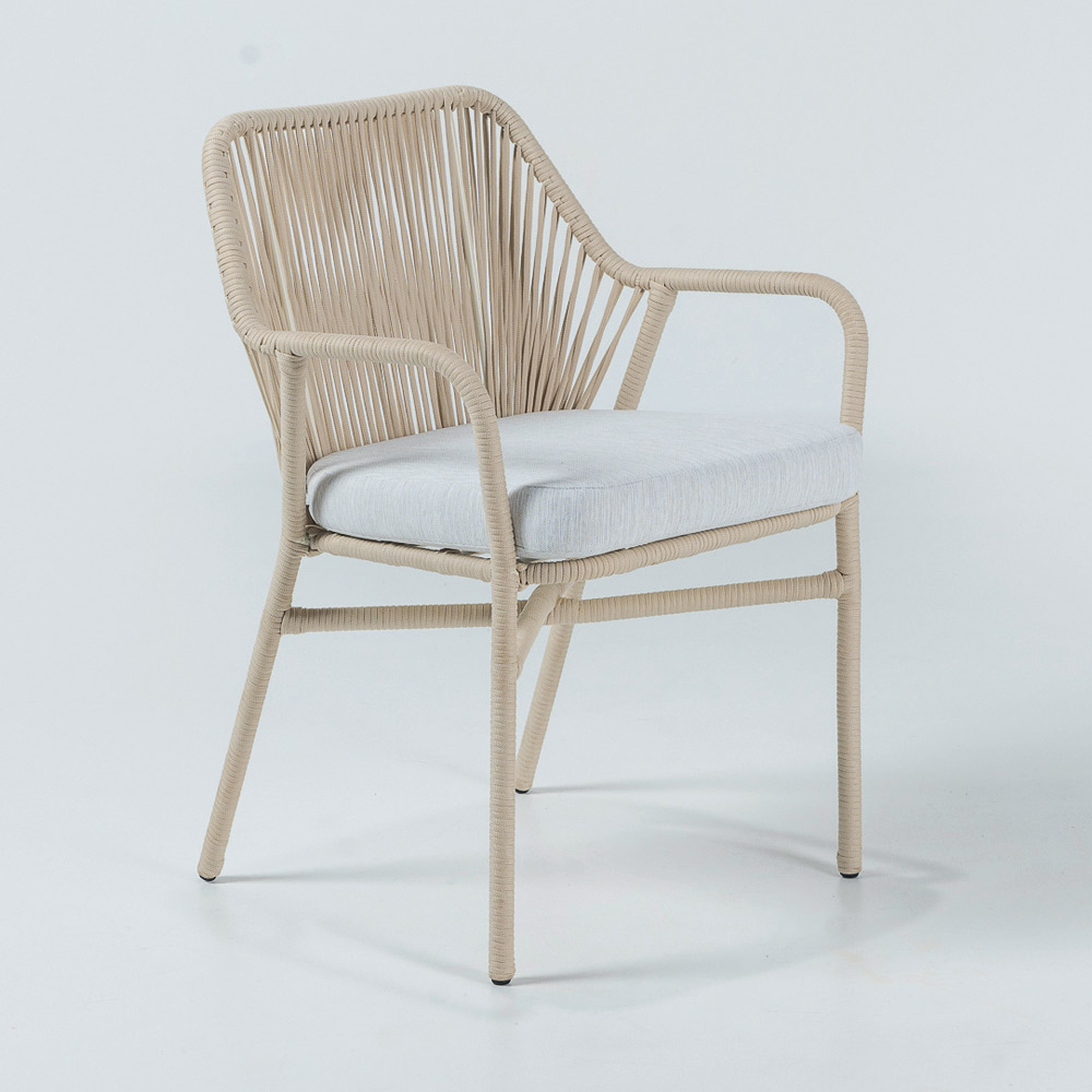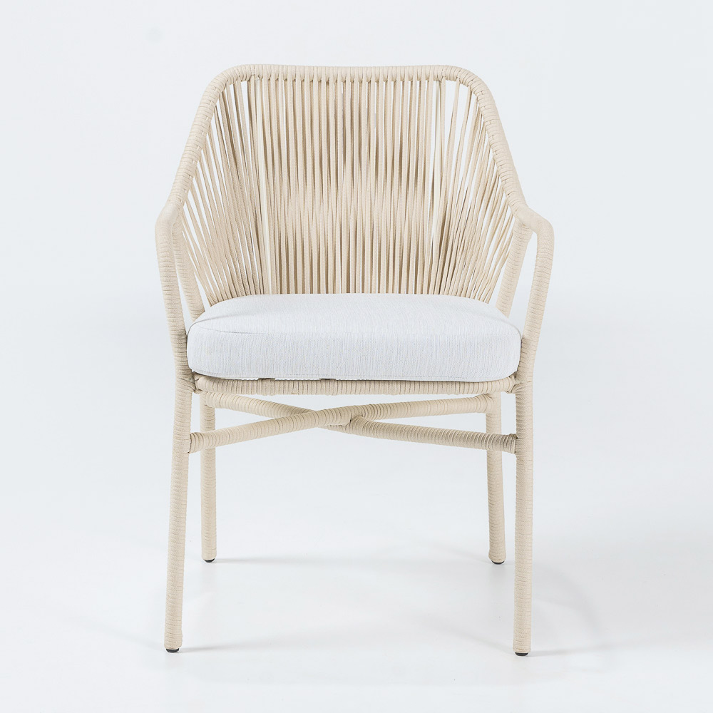 Poltrona para área externa feita com estrutura de alumínio, trama de Olefina/PP ROPE e almofada do assento em olefina na cor da série "off white".