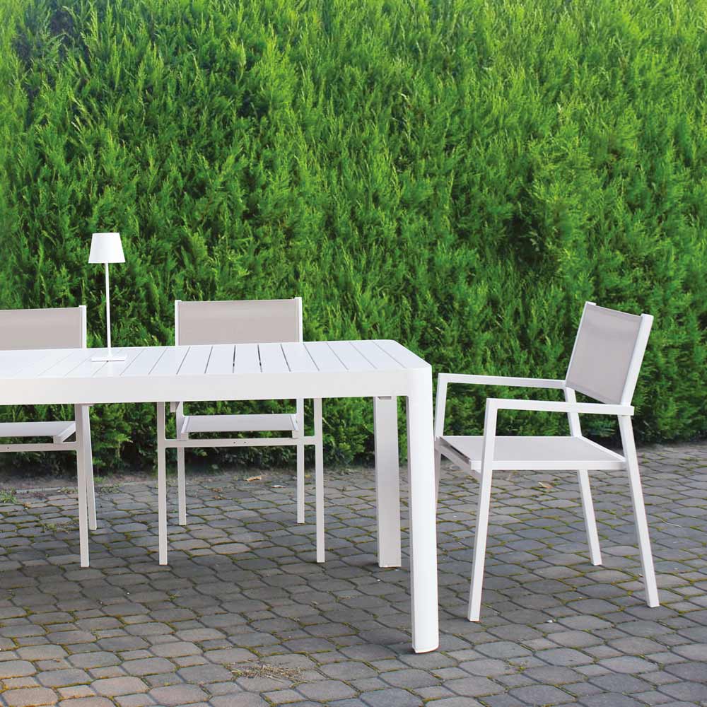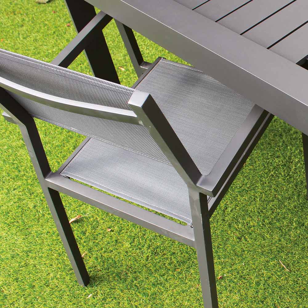 O assento e o encosto em textilene , um material técnico respirável e confortável, garantem uma experiência ergonômica e agradável, mesmo nos dias mais quentes. A cor confere à cadeira uma elegância sóbria , perfeita para acompanhar mesas de jantar ou de centro em jardins, terraços ou espaços comerciais.