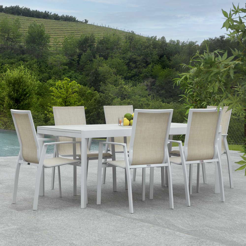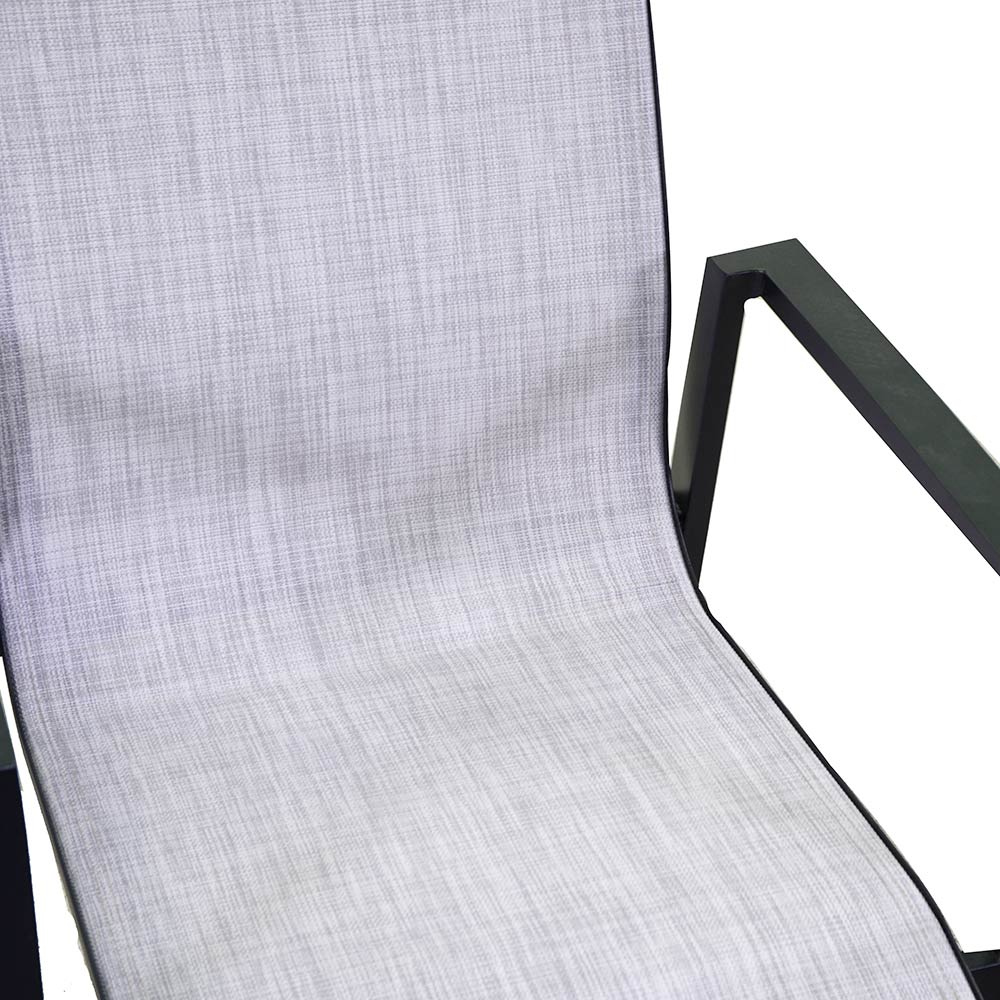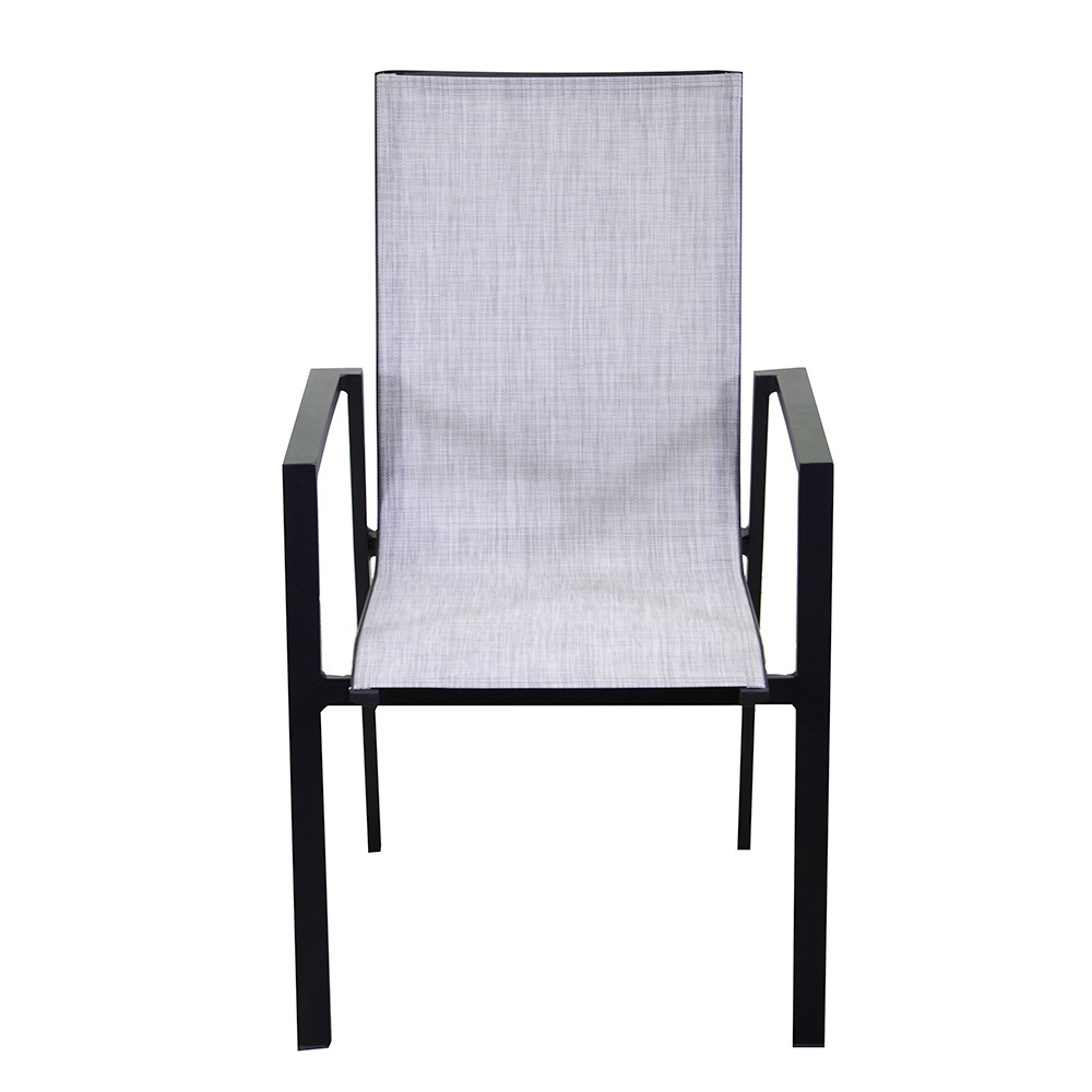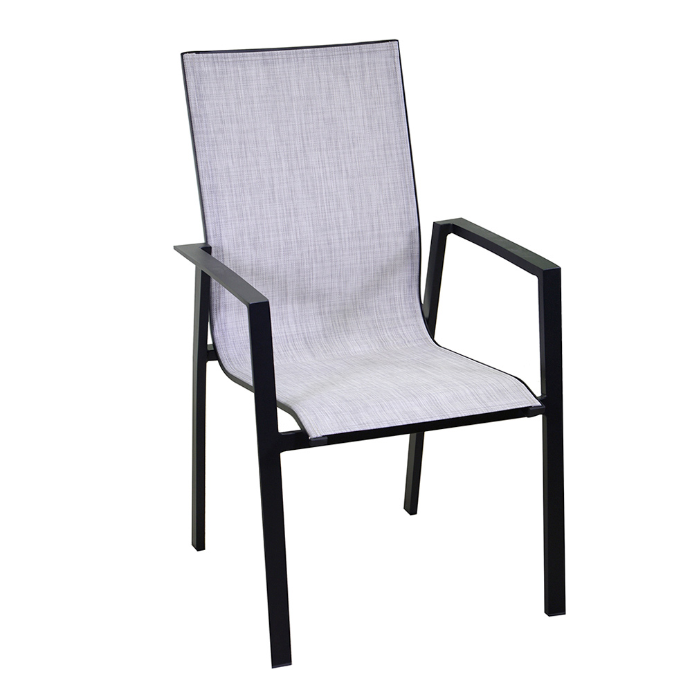 A estrutura de alumínio foi escolhida por sua durabilidade e resistência às intempéries, garantindo que a cadeira mantenha sua aparência impecável temporada após temporada. O estofo em textilene acrescenta um toque de elegância, além de ser incrivelmente fácil de manter e limpar.