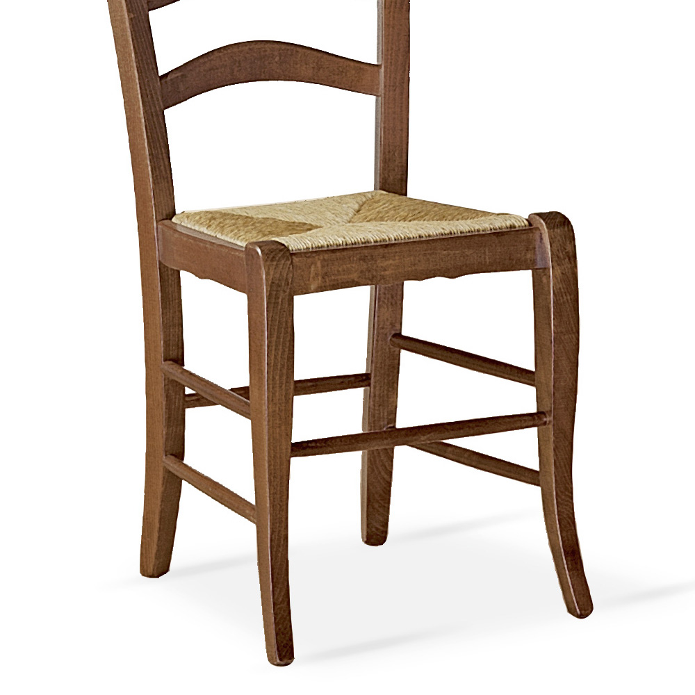 Cadeira moderna para ambientes internos com estrutura em faia tingida de nogueira e sentado feito de palha.
