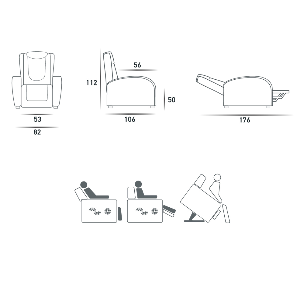 Mecanismos com um ou dois motores , movimentos alternativos, autônomos ou independentes , do apoio para os pés e do encosto , função de elevação , dispositivo de elevação que permite assumir facilmente uma posição vertical, vibração para um efeito agradável distribuído no encosto, assento e apoio para os pés, movimento automático ou motorizado: estas são as possibilidades e combinações desenvolvidas: um conjunto harmonioso de soluções para satisfazer todos os tipos de necessidades.