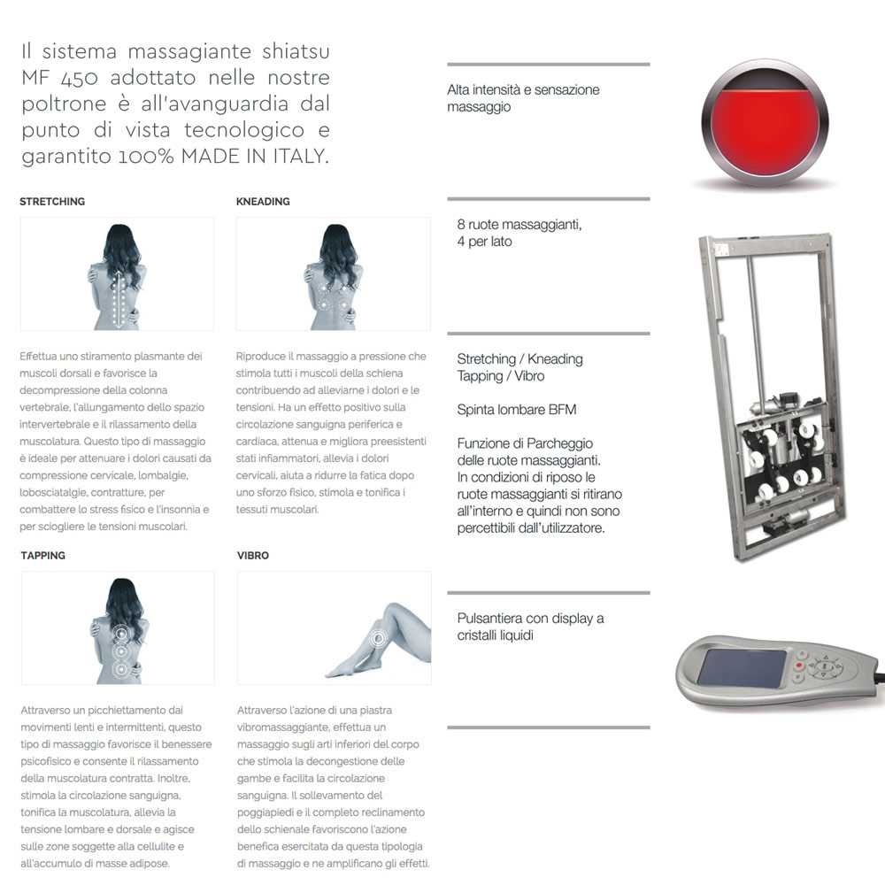 A poltrona de relaxamento Bria também conta com a massagem Shiatsu MF450 , um tipo de massagem utilizada para melhorar a circulação sanguínea e linfática, gerando tranquilidade interior e bem-estar físico. O sistema de massagem possui um mecanismo com dois braços equipados com rodas massageadoras montadas em trilhos que deslizam ao longo dos contornos das costas, proporcionando uma massagem constante e uniforme em toda a superfície dorsal. O sistema de massagem Shiatsu MF450 é tecnologicamente de ponta e com garantia de fabricação 100% italiana .