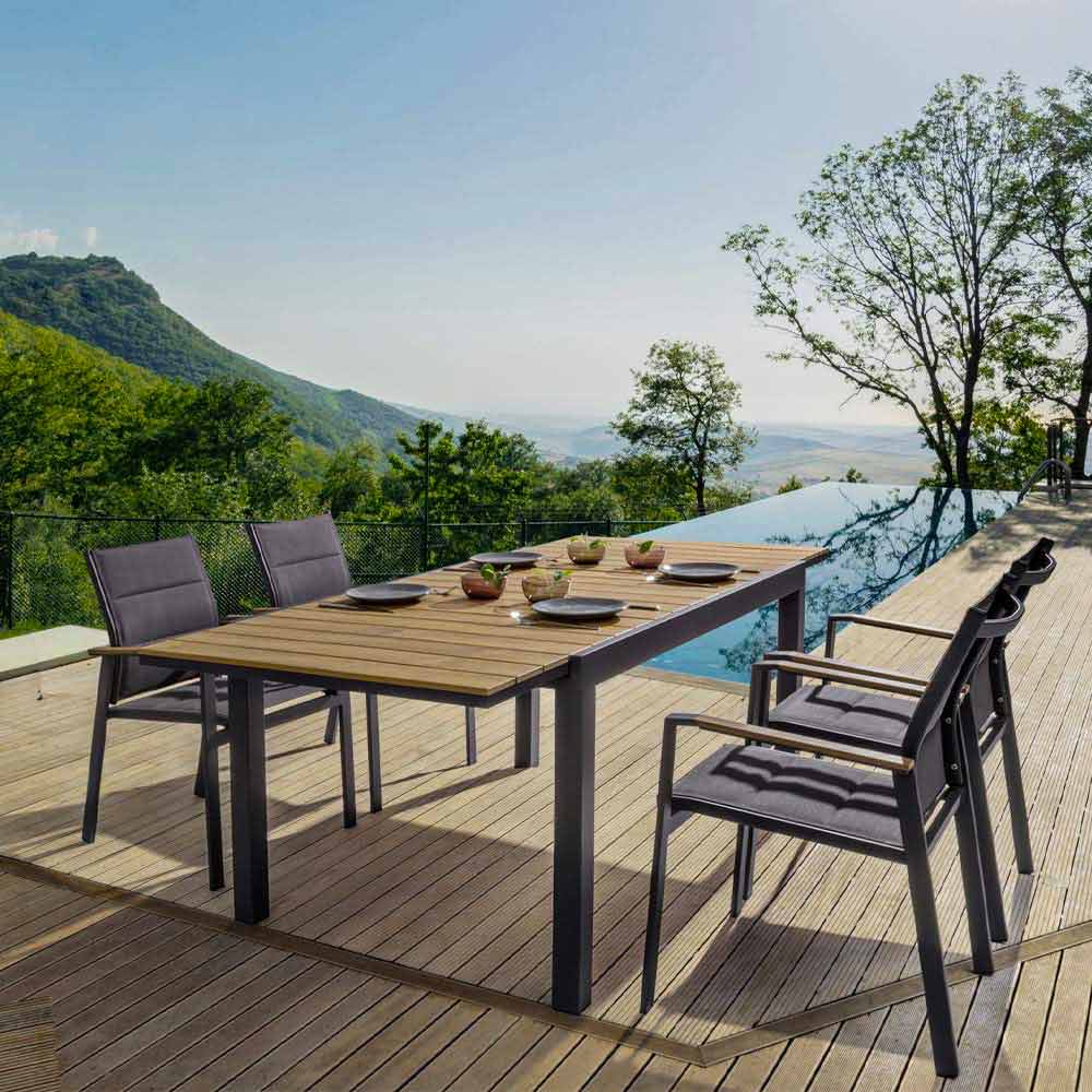 Estrutura em alumínio com revestimento em pó (poliéster). Apoios de braço com inserções de polywood. Estofamento do assento e encosto em textilene 2x2 (com acolchoamento). Empilhável .