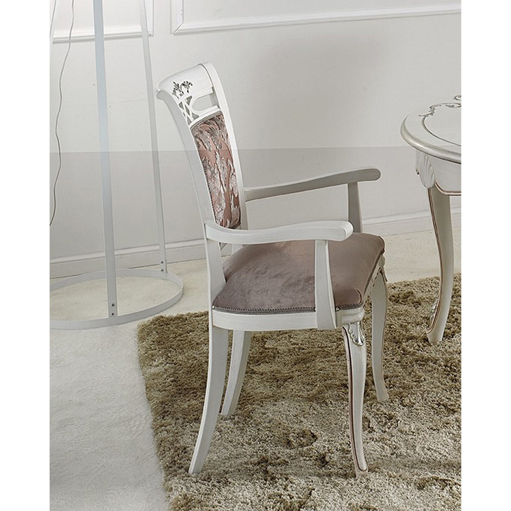 branco e prata . Esta cadeira tem assento e encosto acolchoados revestidos a tecido e adaptam-se a todas as necessidades oferecendo o máximo conforto, sendo também possível escolher entre a versão com ou sem braços. Um complemento único e refinado, totalmente