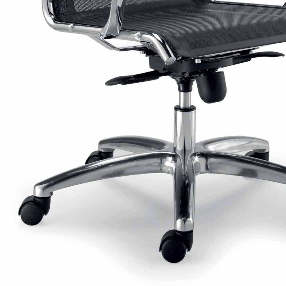 Caracterizado por um mecanismo oscilante com fulcro avançado de duas alavancas em aço prensado, completo com 4 posições de travamento, sistema de segurança de encosto anti-choque e ajuste da tensão da mola para a calibração do giro por meio de um botão. Além disso, sua beleza aumenta com os braços de alumínio cromados e a base de 5 estrelas em alumínio polido, com rodas de frenagem de Ø 50 mm.