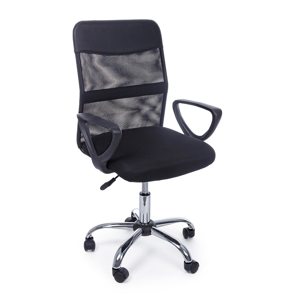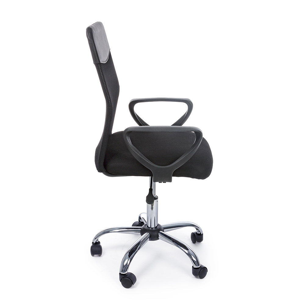 Esta cadeira de escritório é feita com uma base sólida de açocromado de 53 cm de diâmetro e rodas de náilon. O assento ajustável em altura é acolchoado eestofado em tecido 100% poliéster enquanto o encosto é estofado em tecido 100% poliéster com inserção de couro sintético. Apoios de braços em plástico (polipropileno). Design para montar.