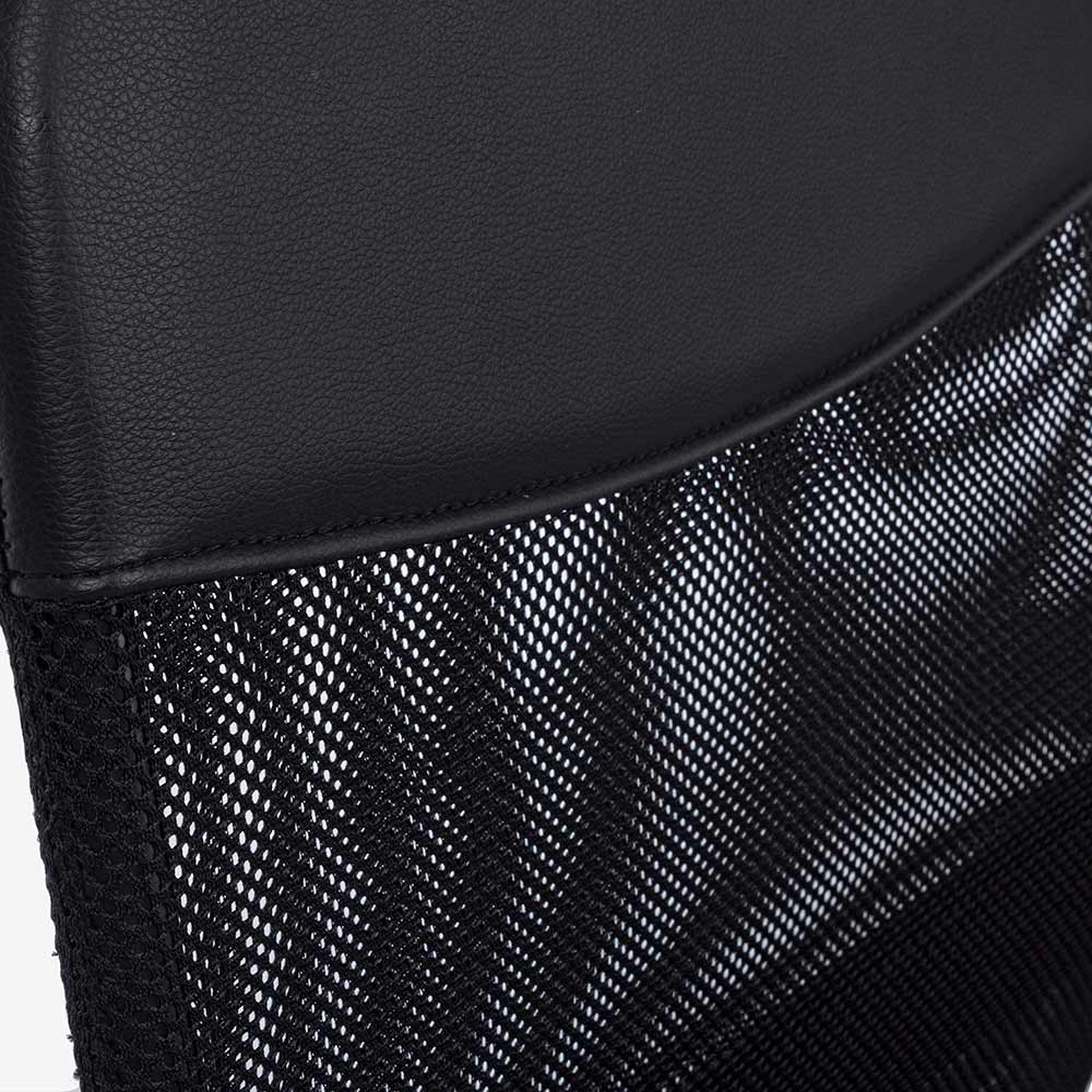 Poltrona giratória de escritório em tecido de malha de aço e preto com braços.