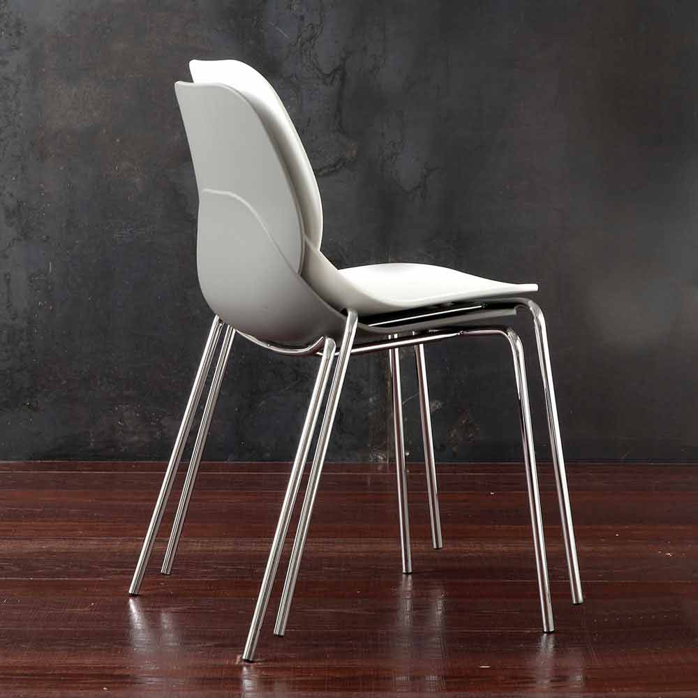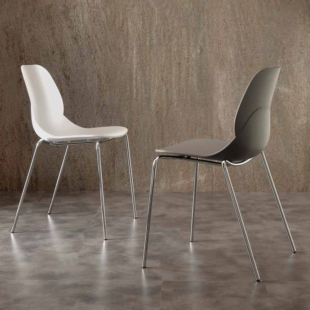 Cadeira moderna com estrutura metálica e corpo em polipropileno, disponível nas cores branco ou cinza quartzo RAL 7037.