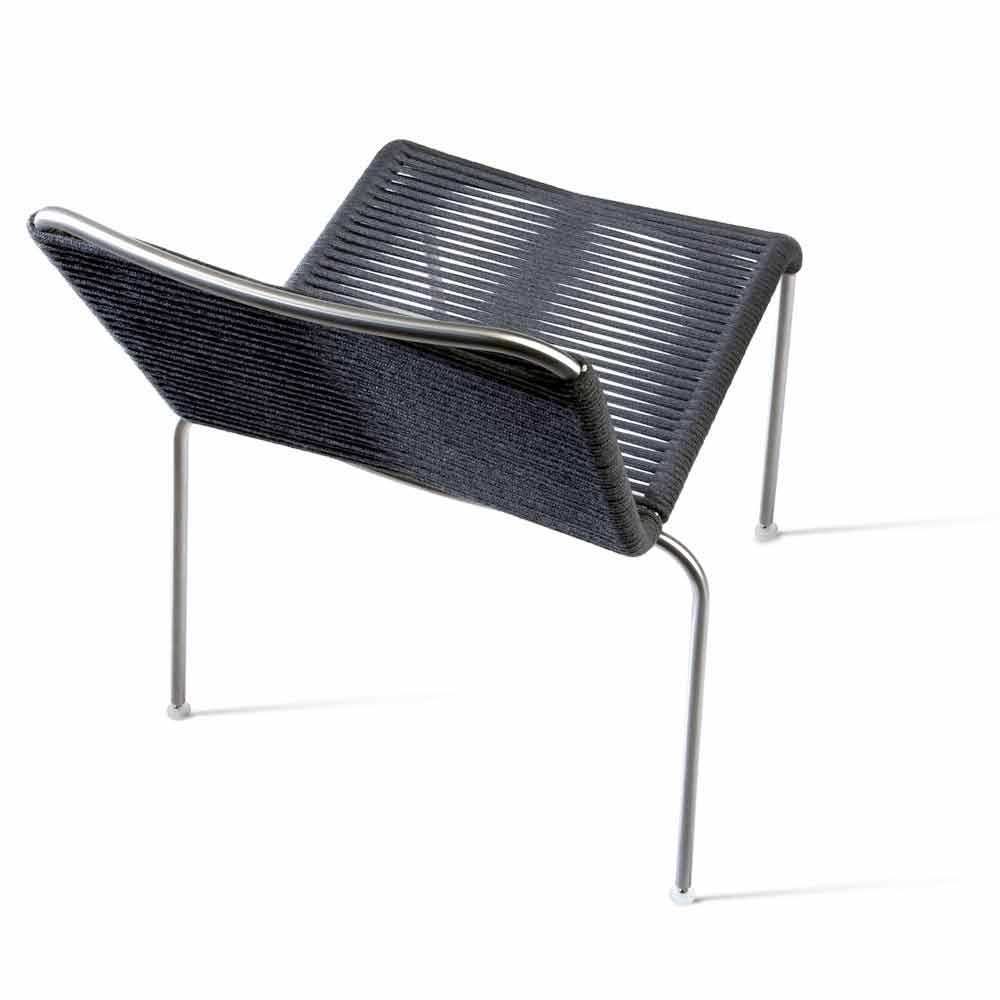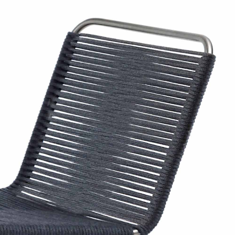 É uma cadeira sem braços com estrutura em aço inoxidável acetinado. Assento e encosto tecidos com cordão acrílico.