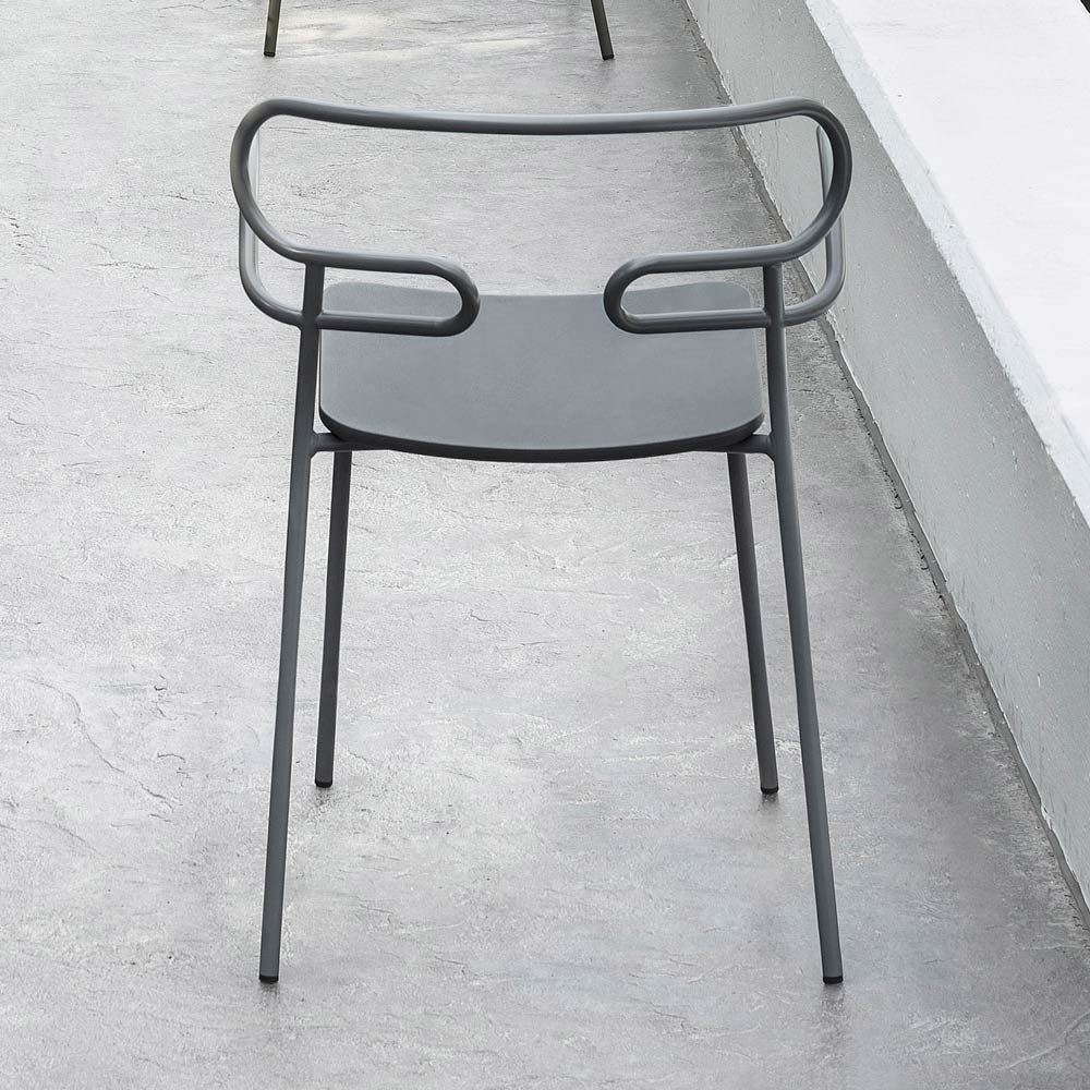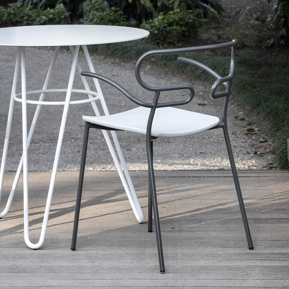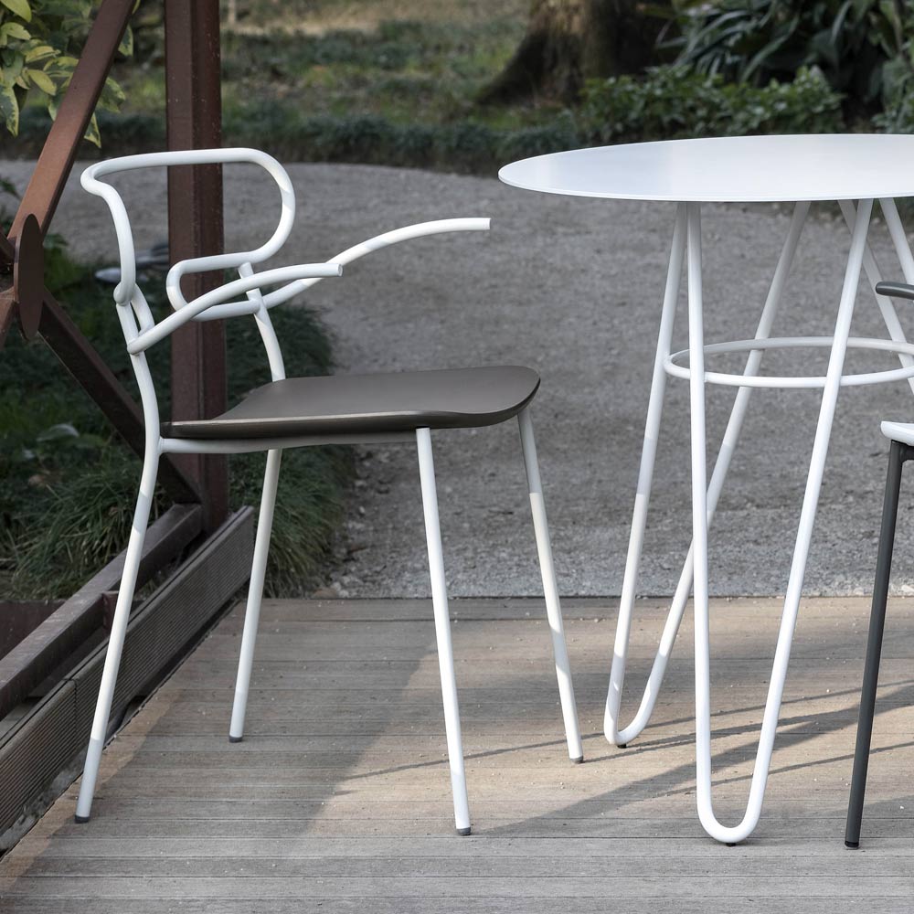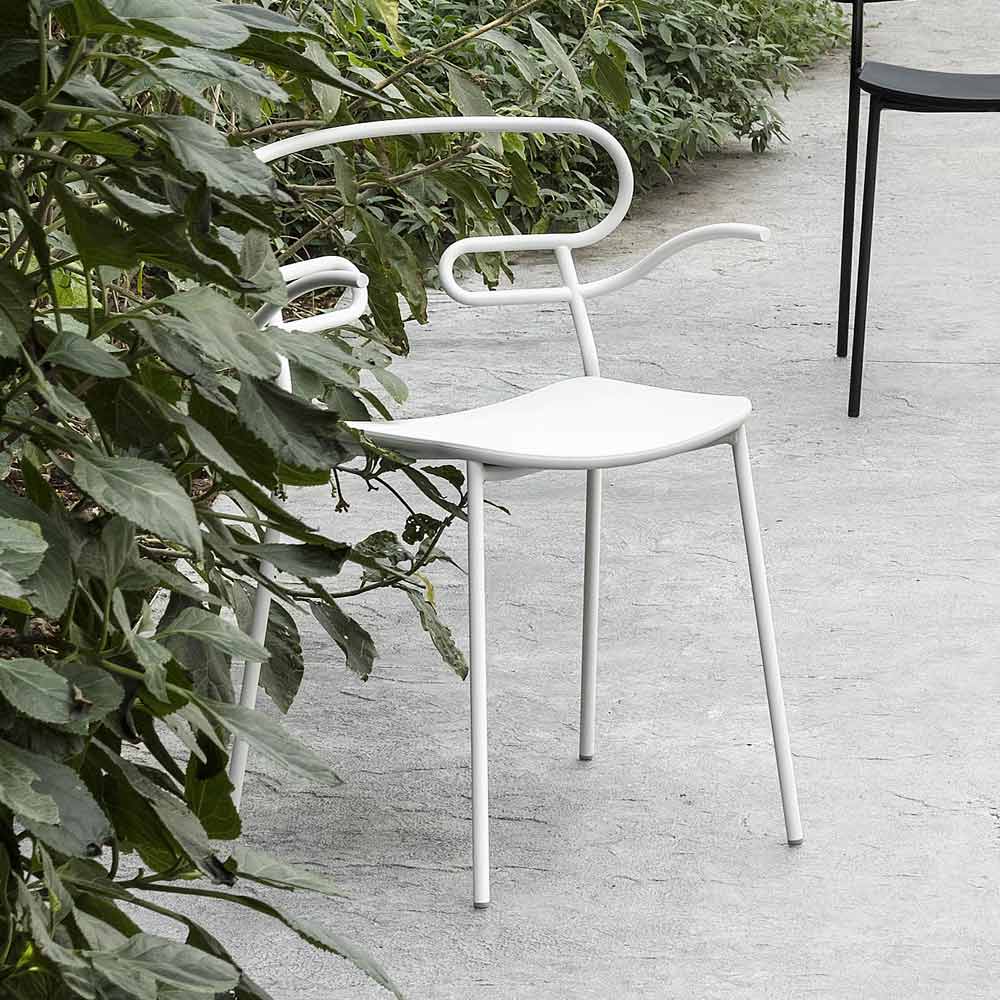 Cadeira de exterior fabricada na Itália com estrutura metálica pintada e assento em poliuretano. Simples e essencial, este complemento destaca-se pelas suas linhas leves e pela forma particular do encosto obtida através da curvatura de um único tubo metálico, criando assim um design invulgar e vanguardista. Ideal para decorar com personalidade os seus espaços exteriores como jardins, varandas e terraços, tem uma particularidade funcional que é a possibilidade de empilhar para obter uma solução prática e de fácil disposição otimizando os seus espaços quando as cadeiras não são utilizadas.