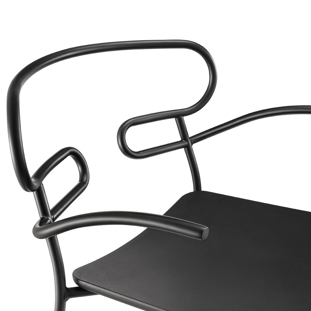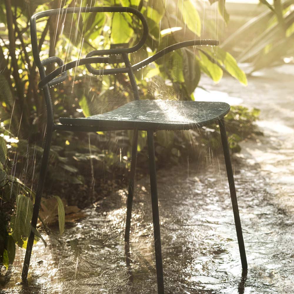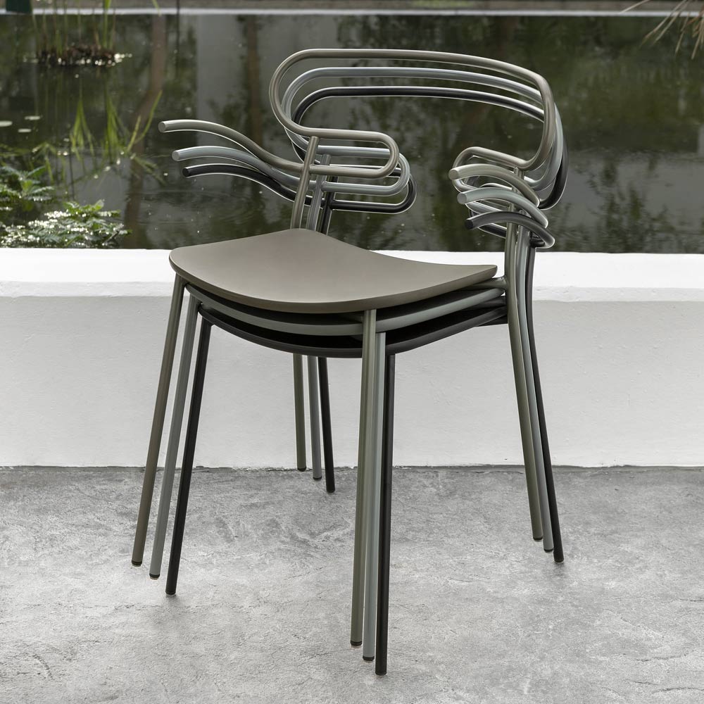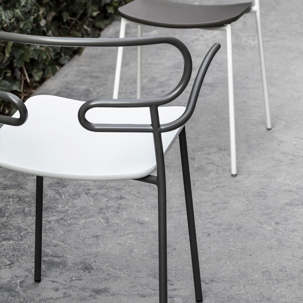 Cadeira de exterior fabricada na Itália com estrutura metálica pintada e assento em poliuretano. Simples e essencial, este complemento destaca-se pelas suas linhas leves e pela forma particular do encosto obtida através da curvatura de um único tubo metálico, criando assim um design invulgar e vanguardista. Ideal para decorar com personalidade os seus espaços exteriores como jardins, varandas e terraços, tem uma particularidade funcional que é a possibilidade de empilhar para obter uma solução prática e de fácil disposição otimizando os seus espaços quando as cadeiras não são utilizadas.