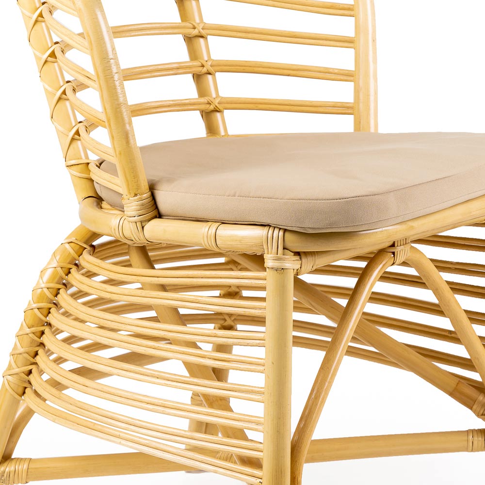 Cadeira de exterior feita de vime natural tecido e equipada com uma almofada de assento com estofamento no padrão "Stone Beige" acabamento .