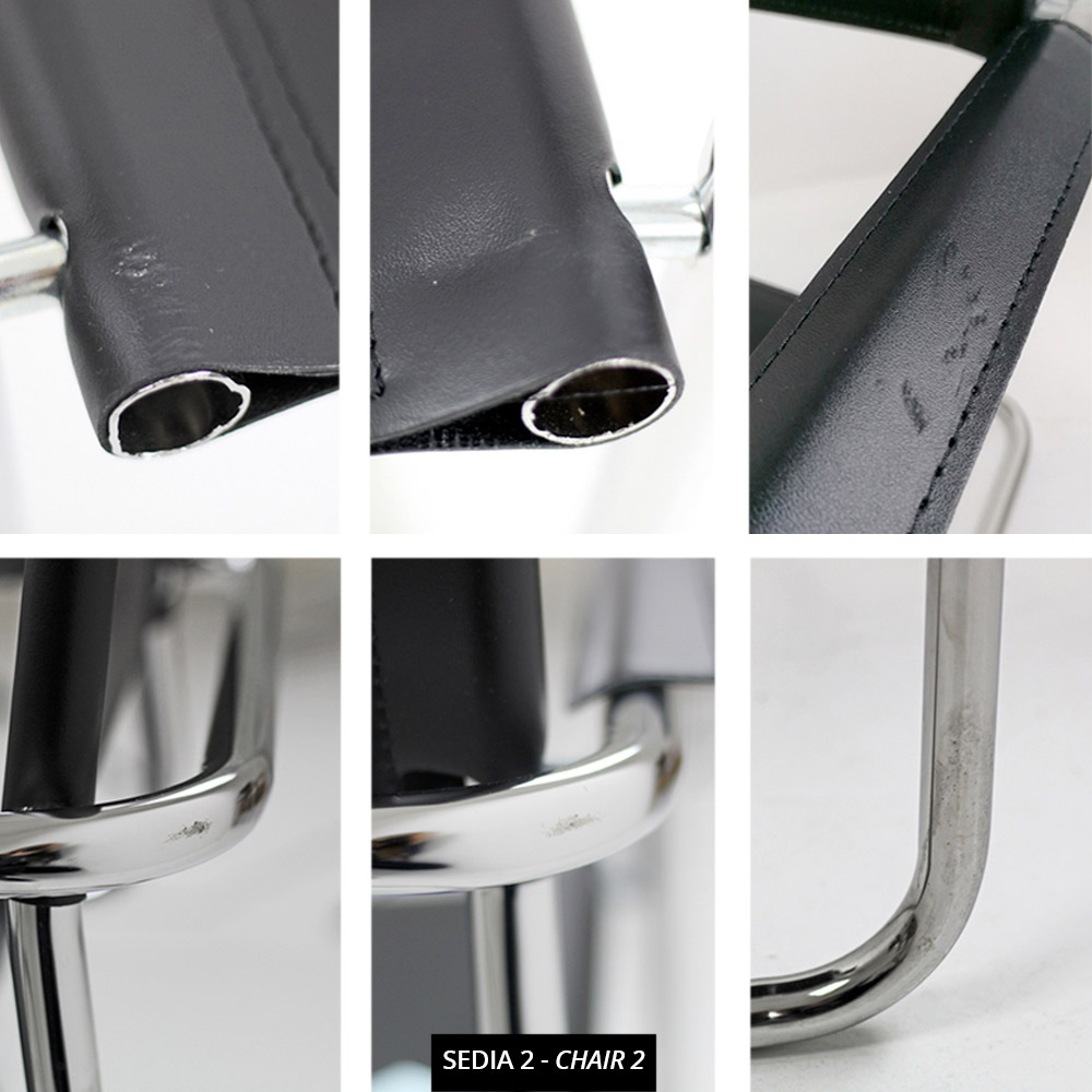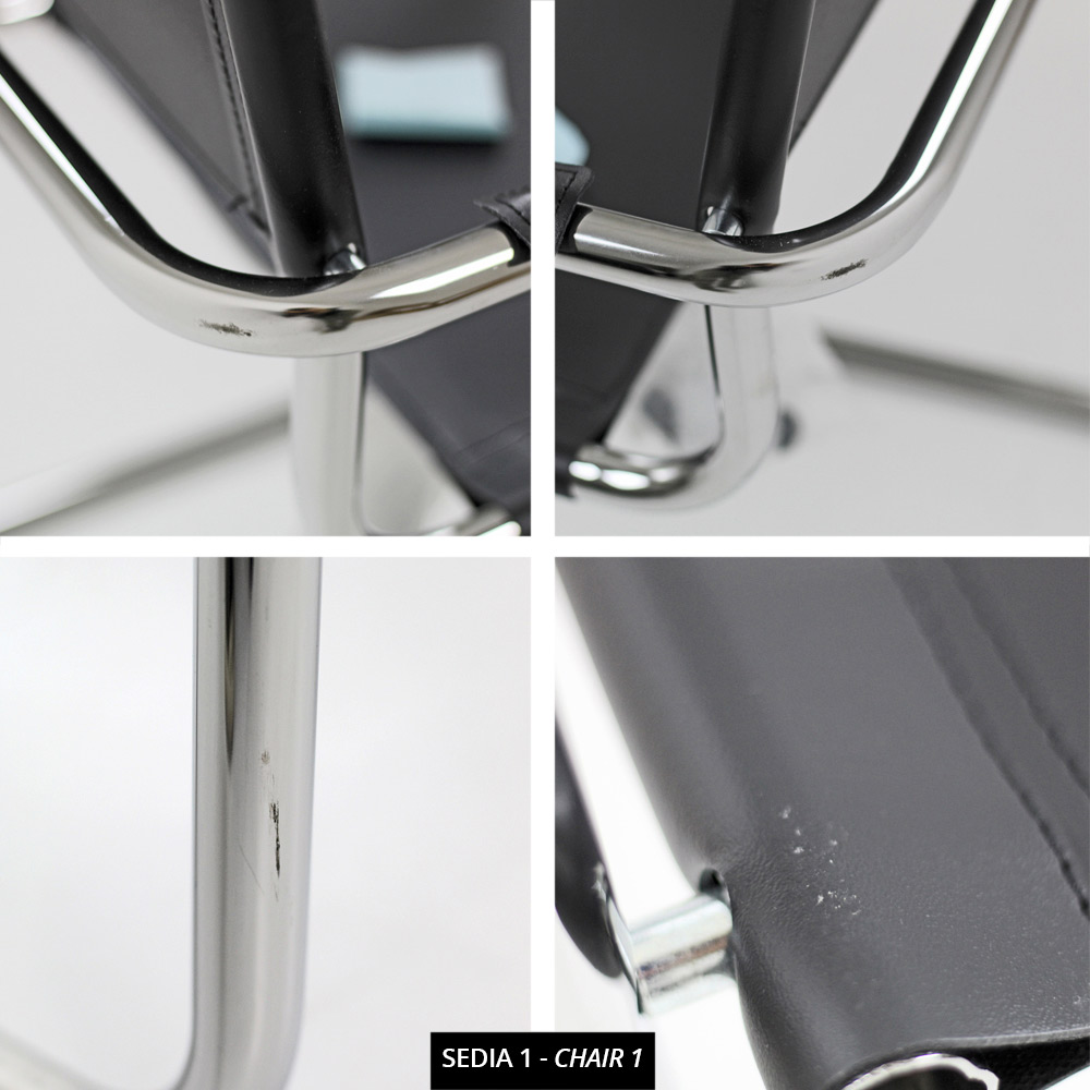 Cadeira moderna para sala de reuniões ou conferências, em metal cromado e couro sintético preto.