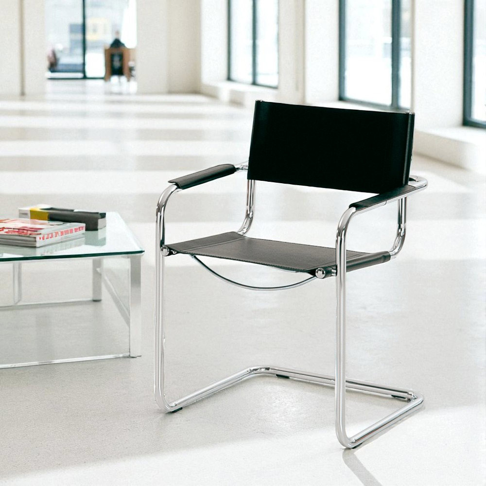 A cadeira Cirillo com apoios de braços para salas de reuniões ou salas de conferência é ideal porque reúne todas essas características; possui uma estrutura de metal cromado e assento, encosto e apoios de braços em couro sintético preto.