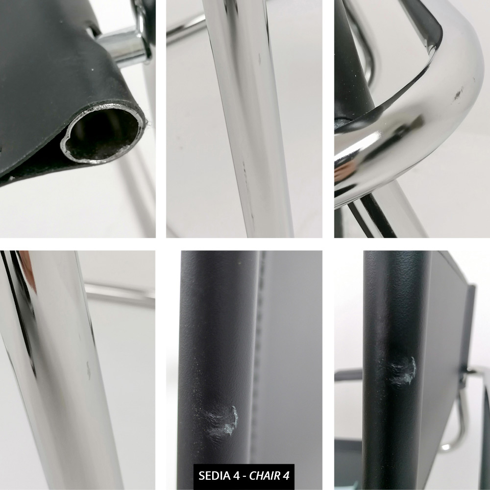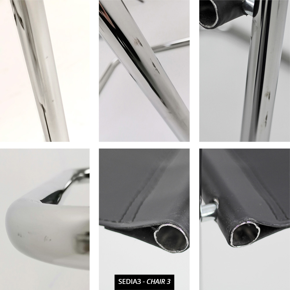 Cadeira moderna para sala de reuniões ou conferências, em metal cromado e couro sintético preto.