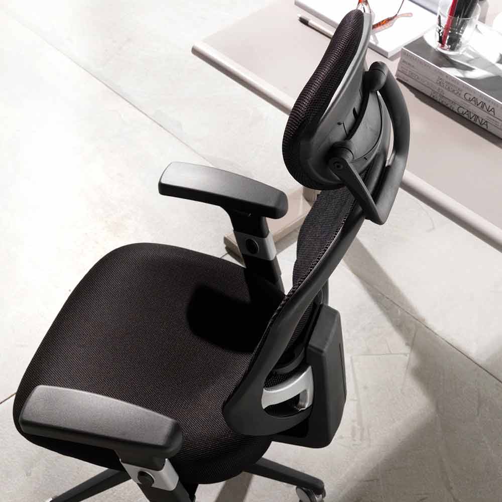 Cadeira giratória moderna em malha microperfurada preta e estrutura em nylon preto.