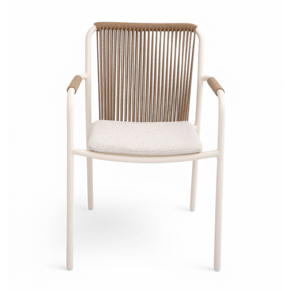 Esta cadeira de exterior combina design moderno e conforto excecional , tornando-a perfeita para o seu espaço ao ar livre. A estrutura de metal pintado garante resistência às intempéries e durabilidade ao longo do tempo, enquanto a trama de corda adiciona um toque de elegância natural.