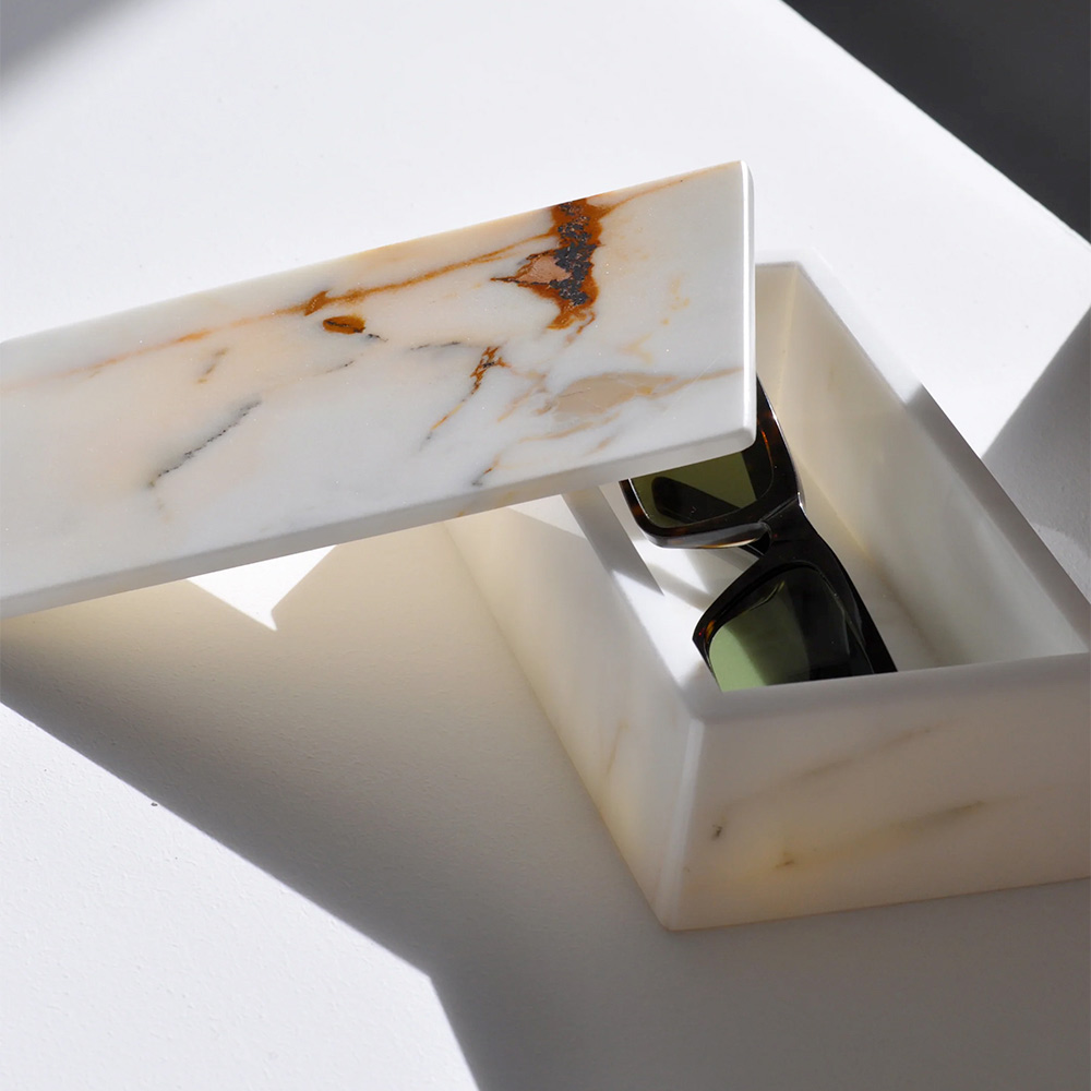 A tampa oferece proteção para seus óculos, mantendo-os protegidos contra poeira e arranhões, e a sólida construção em mármore garante durabilidade atemporal. Este porta-óculos não só protegerá os seus preciosos óculos, mas também adicionará um toque de luxo a qualquer mesa de cabeceira, secretária ou consola.