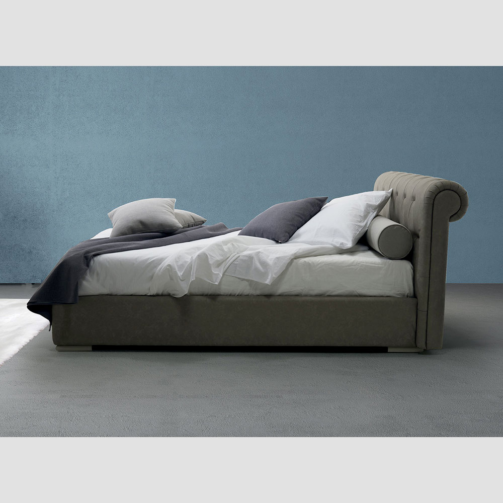 Cama de casal estofada de luxo em tecido ou couro ecológico, feita à mão na Itália com caixa de armazenamento.