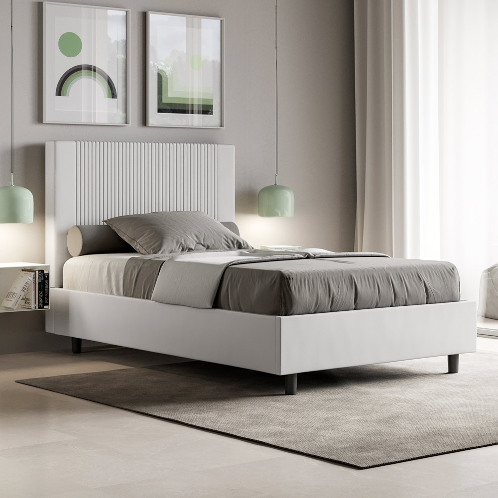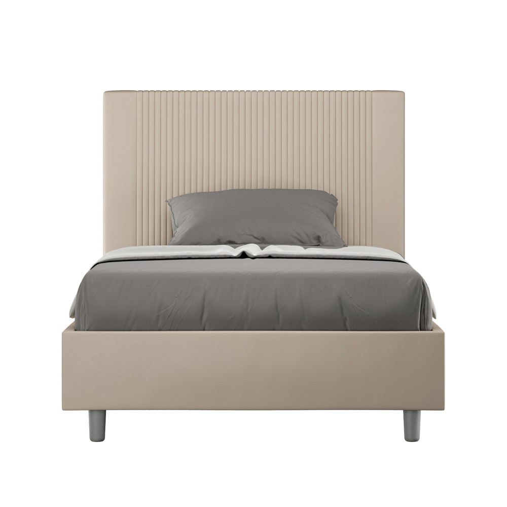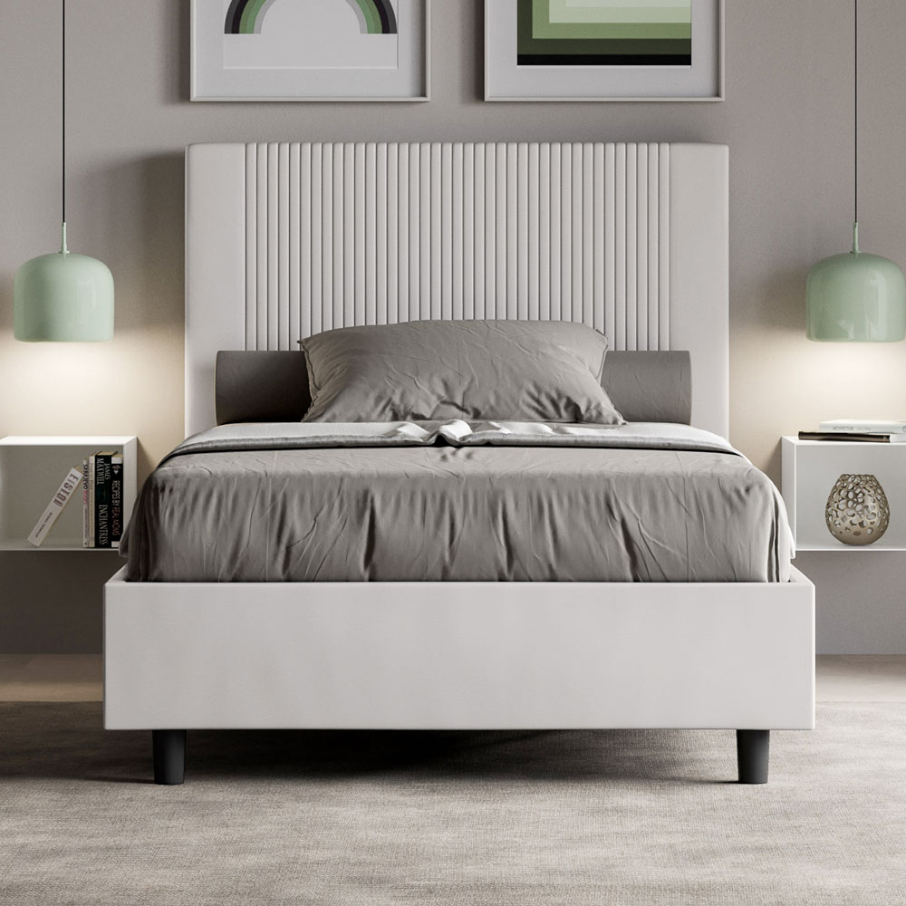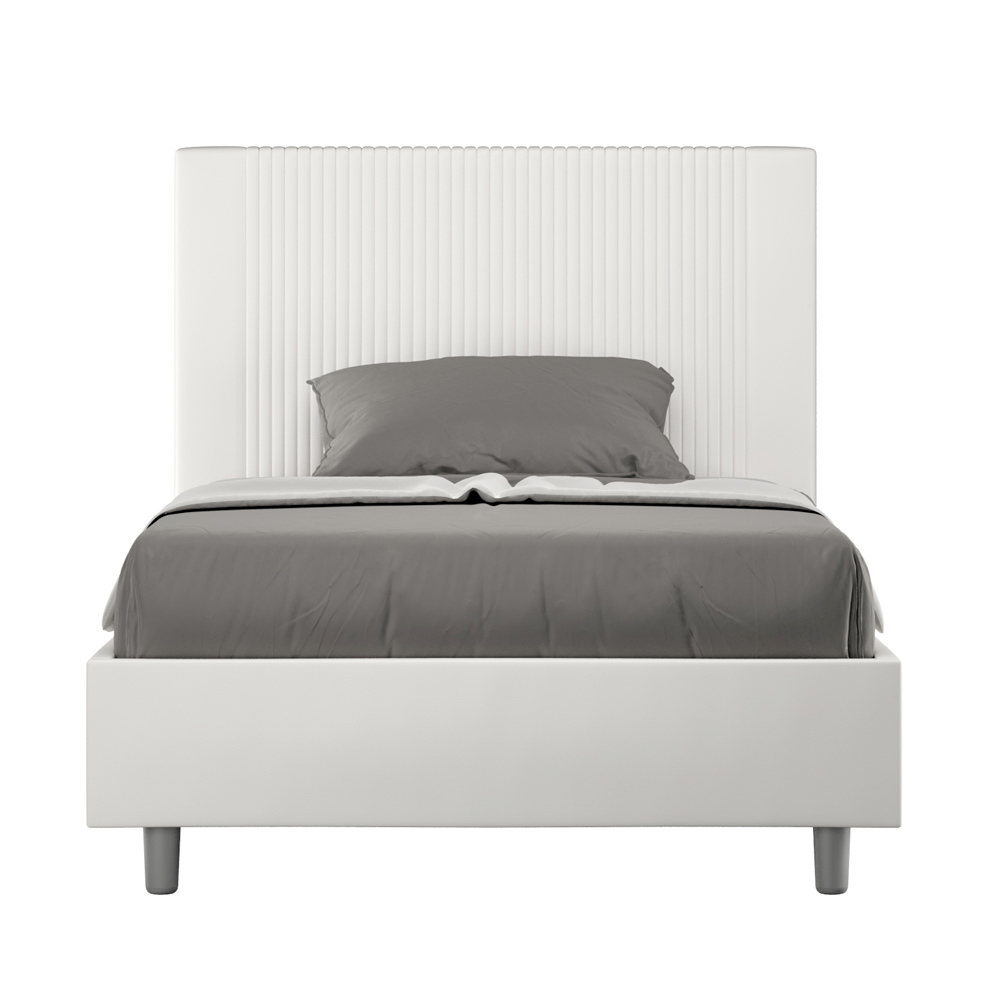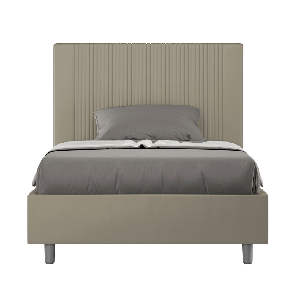 Cama de casal estofada de 120x200 cm, feita de painéis de aglomerado e revestida em imitação de couro , inteiramente fabricada na Itália. Esta cama de casal queen-size, com sua estrutura acolchoada, é um produto de fabricação italiana confeccionado em couro sintético. Seu design simples, porém moderno, é perfeito para espaços que se distinguem pela elegância sofisticada. O principal destaque deste modelo é a cabeceira, adornada com um motivo de linhas verticais , ideal para quem deseja combiná-la com ambientes visualmente impactantes, com paredes de destaque, mantendo, ao mesmo tempo, uma elegância inconfundível.
