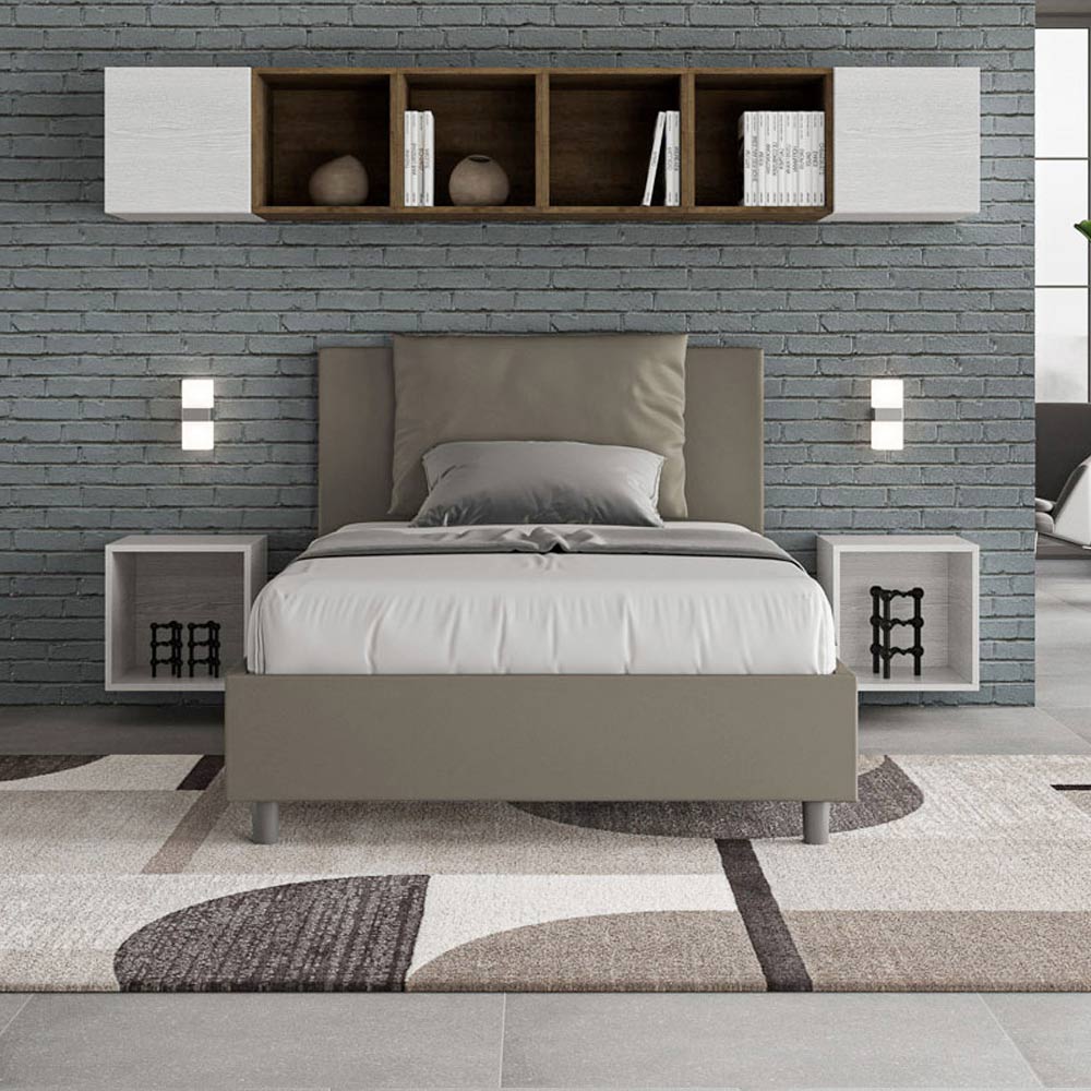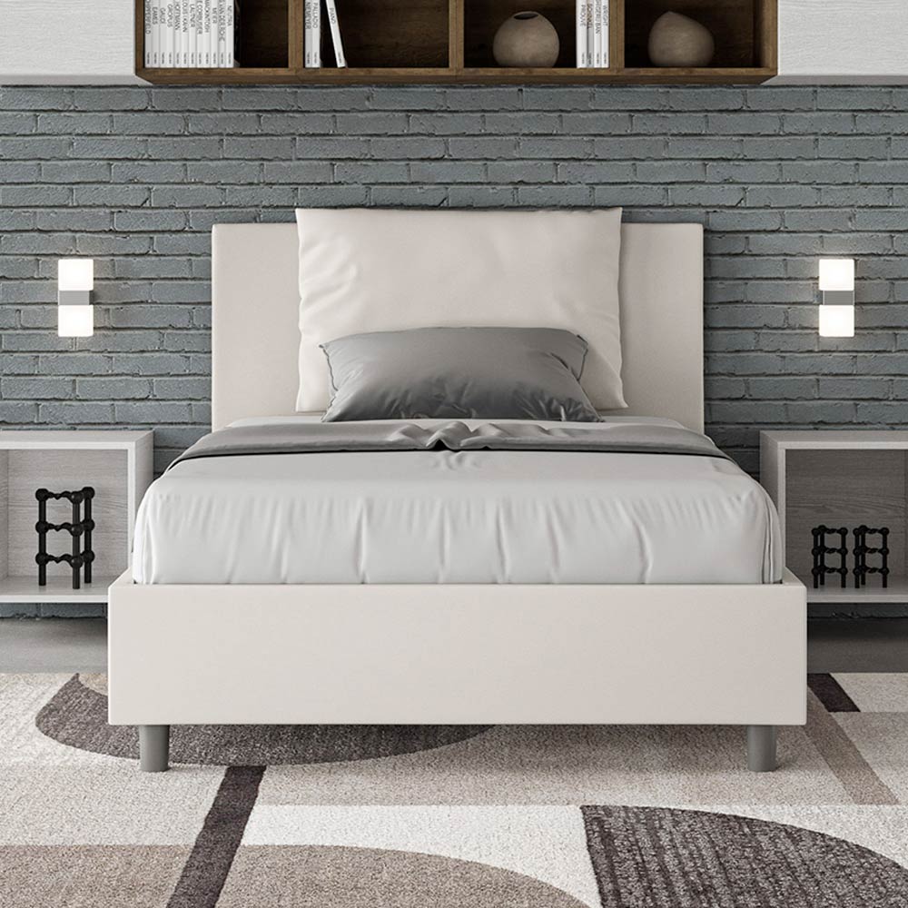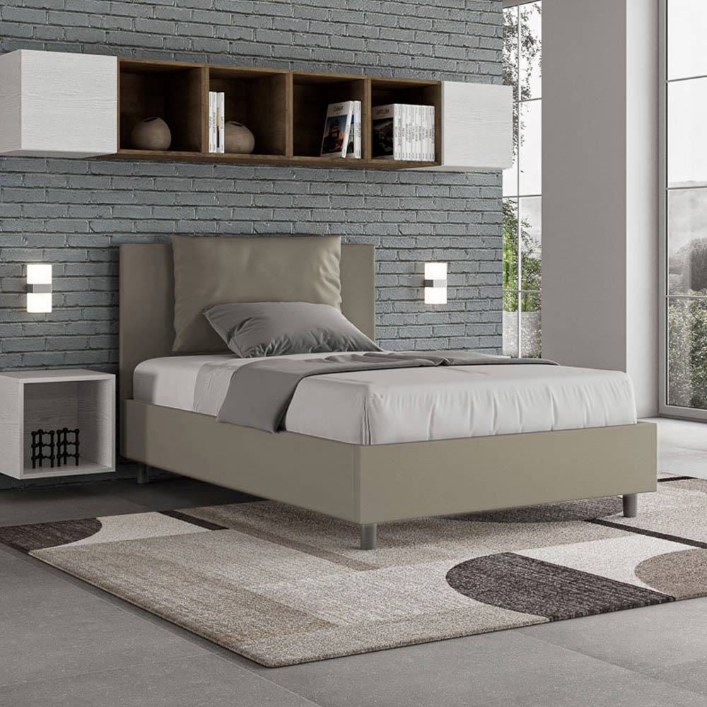 Cama de casal estofada de 120x200 cm, feita de painéis de aglomerado e revestida em imitação de couro , inteiramente fabricada na Itália. Esta cama de casal com estrutura estofada incorpora perfeitamente as vantagens de uma cama estofada: conforto, estilo contemporâneo, funcionalidade e aproveitamento eficiente do espaço . Com sua cabeceira ampla e acolchoada , esta cama oferece um canto relaxante, ideal para leitura ou para assistir TV, valorizando seu quarto. Elegante e sofisticada, esta cama é revestida em couro sintético, facilitando a limpeza: basta passar um pano de microfibra para mantê-la impecável.