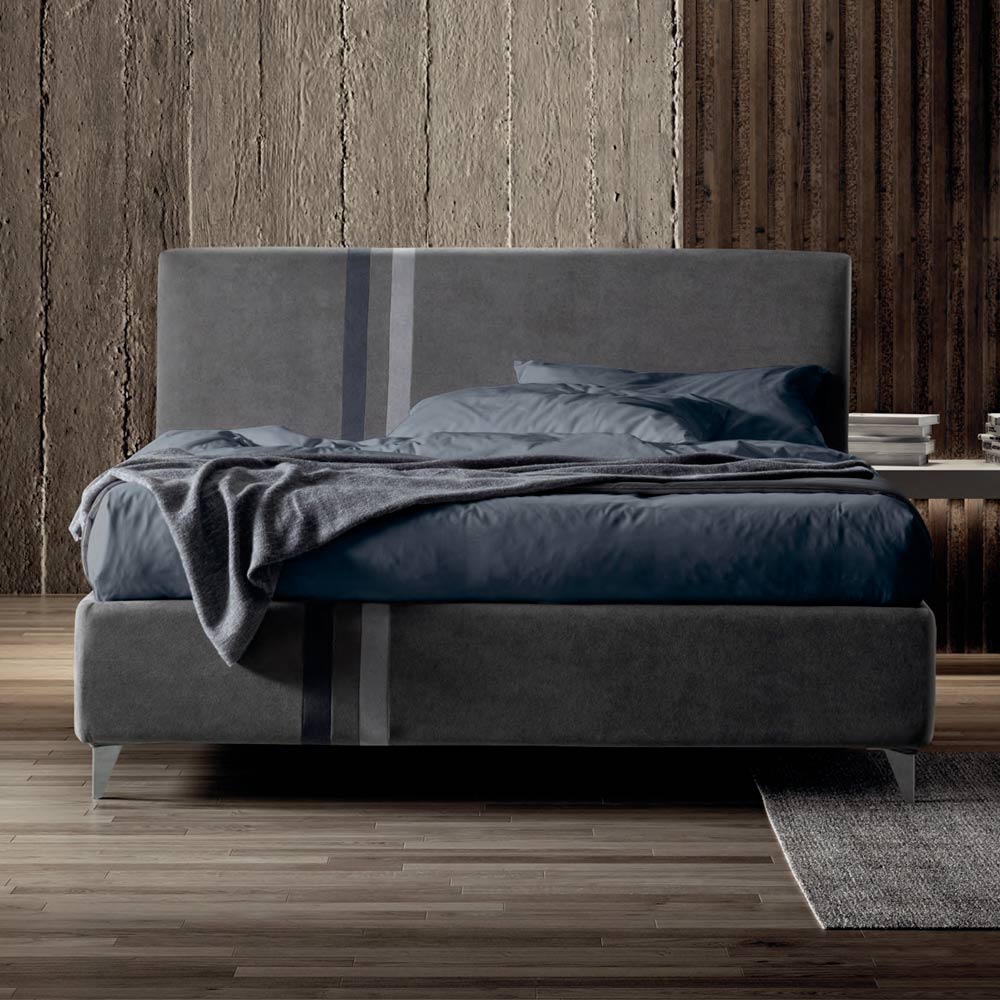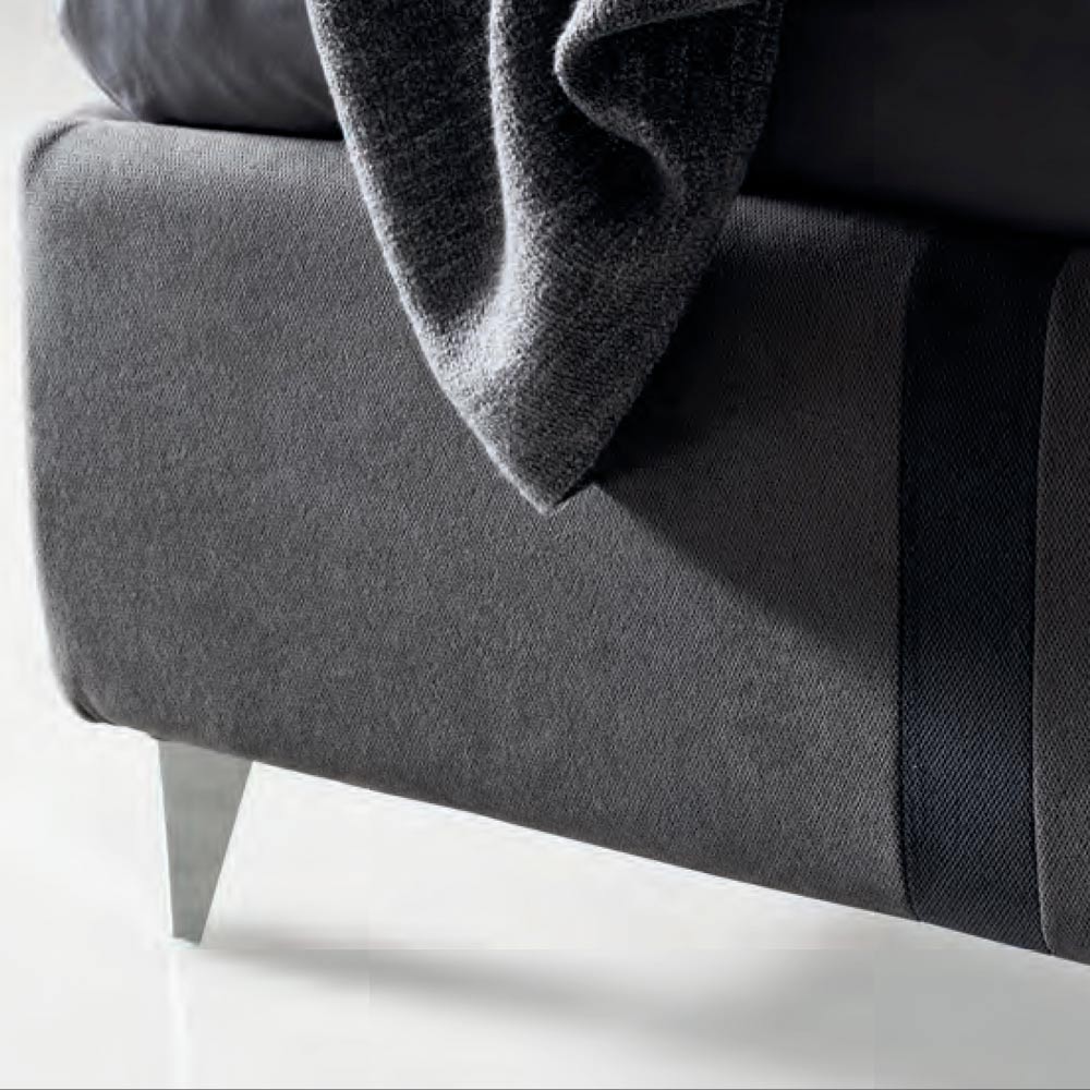 caixa de arrumação, pés metálicos com acabamento em aço polido (altura 12 cm) e cabeceira caracterizada pelo acabamento com duas riscas verticais e paralelas bicolores na cabeceira e estrutura da cama em tecido hidrorrepelente e antimanchas.