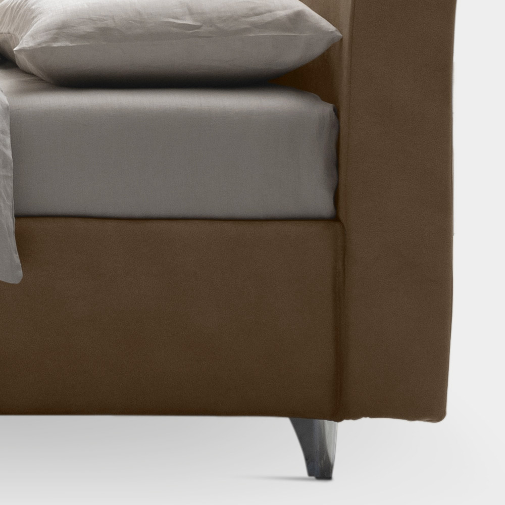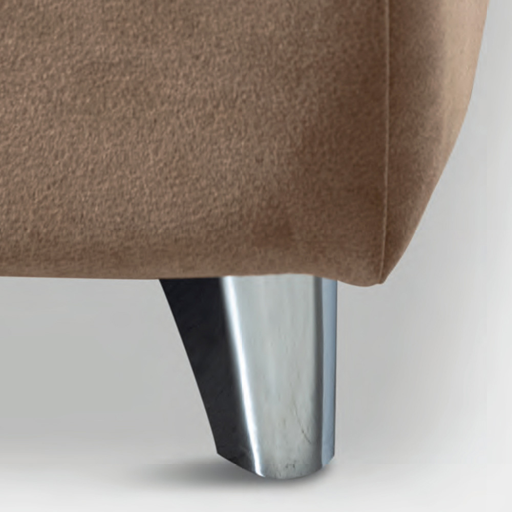 caixa de arrumação, pés metálicos com acabamento em aço polido (altura 10 cm) e cabeceira curva de espessura considerável que faz da cama protagonista de ambientes amplos e requintados. O acabamento, caracterizado por costuras em relevo e contrastantes no centro da cabeceira, oferece um toque de alfaiataria ao produto em tecido antimanchas.