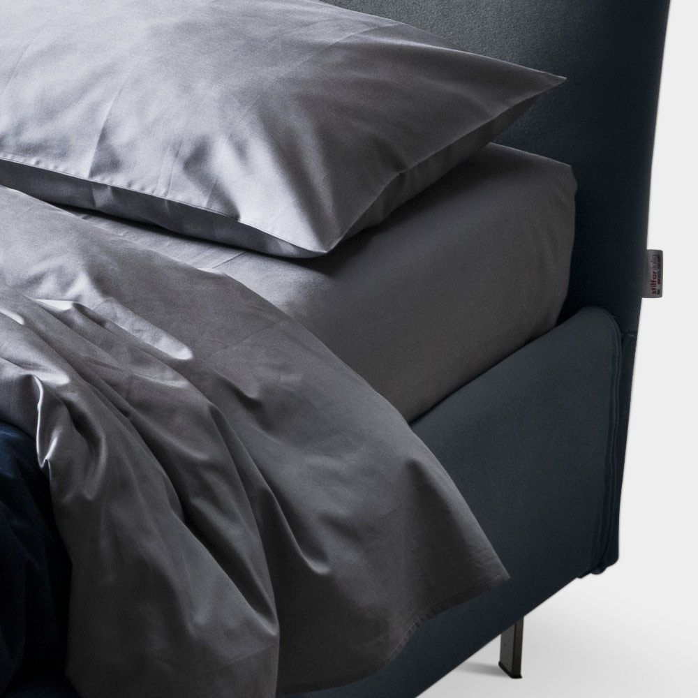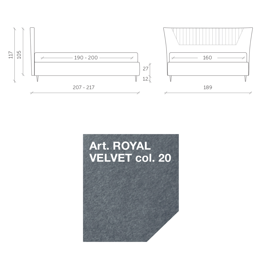 caixa de arrumação, pés metálicos com acabamento em aço polido (altura 12 cm) e cabeceira com um design particular e inovador: as laterais têm linhas curvas e a parte central da cabeceira é feita com inserções acolchoadas com largas ripas verticais em tecido ignífugo.