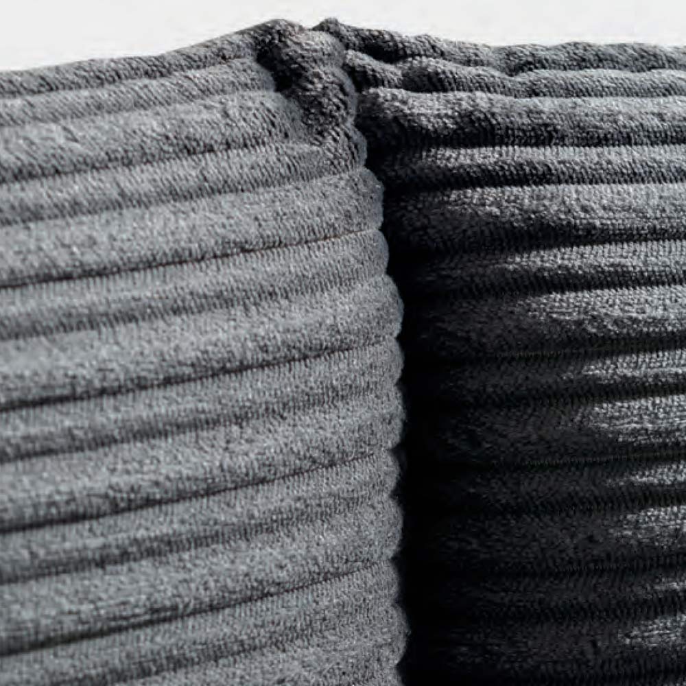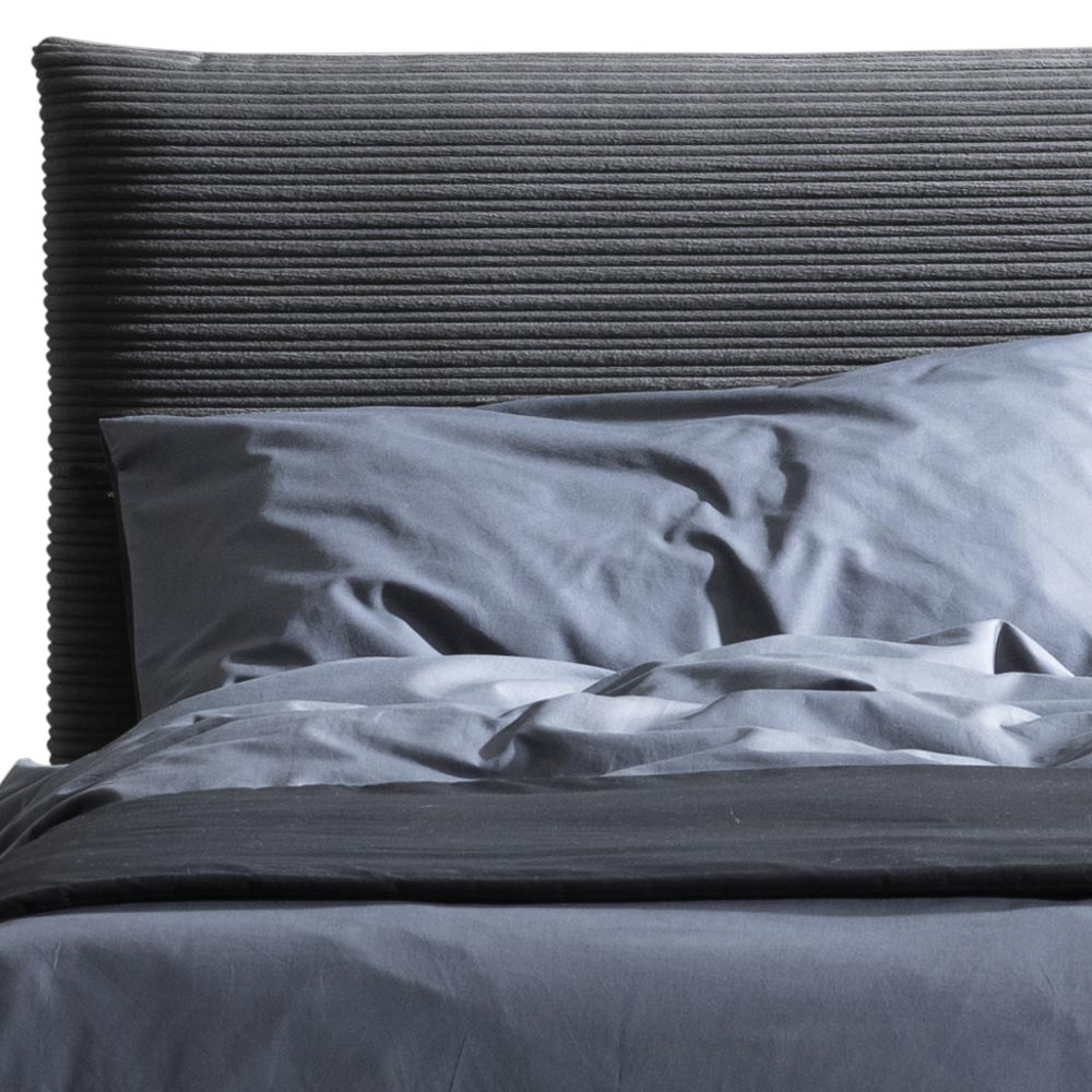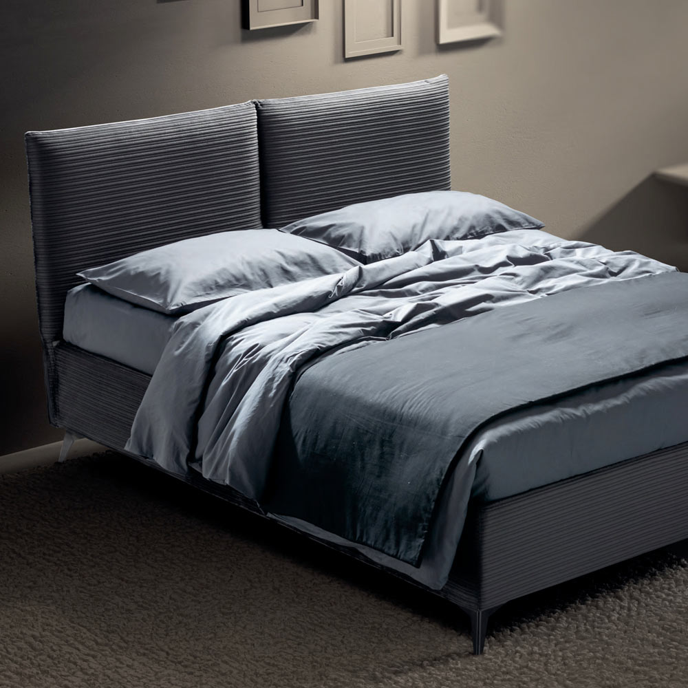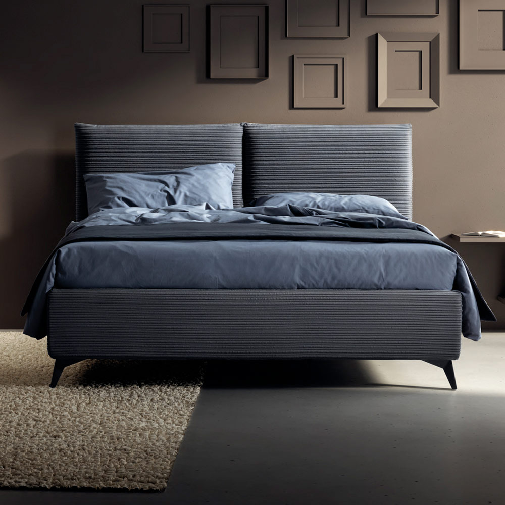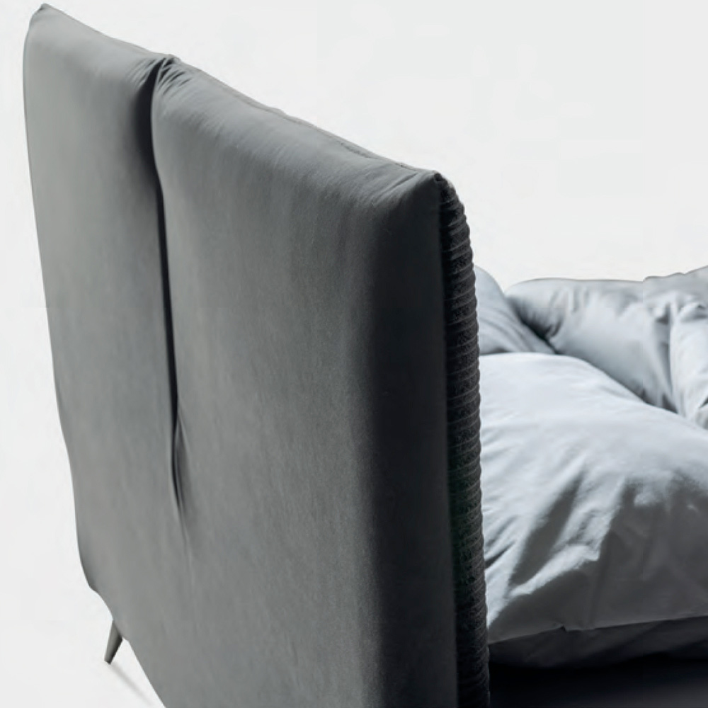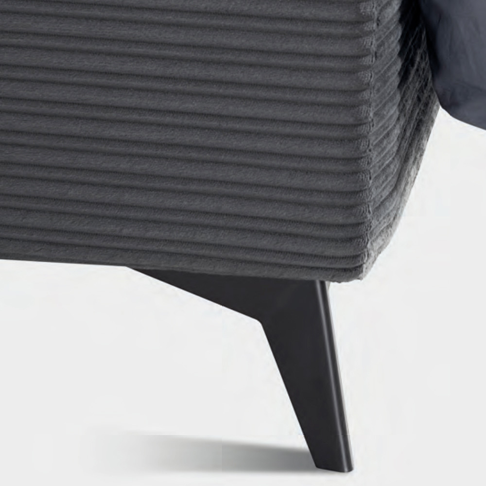metálicos com acabamento antracite (altura 13,5 cm) e cabeceira macia obtida graças a um acolchoamento especial com formato de almofada; a divisão central da cabeceira confere-lhe uma linha particularmente limpa e agradável com um efeito estético original.