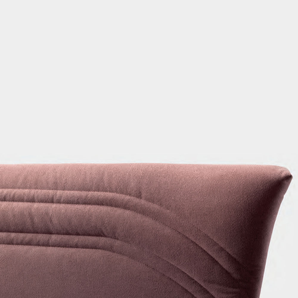 metálicos com acabamento antracite (altura 13,5 cm) e cabeceira única e inovadora, feita com laterais curvas e faixa dupla acolchoada que corre horizontalmente em tecido hidrorrepelente e ignífugo.