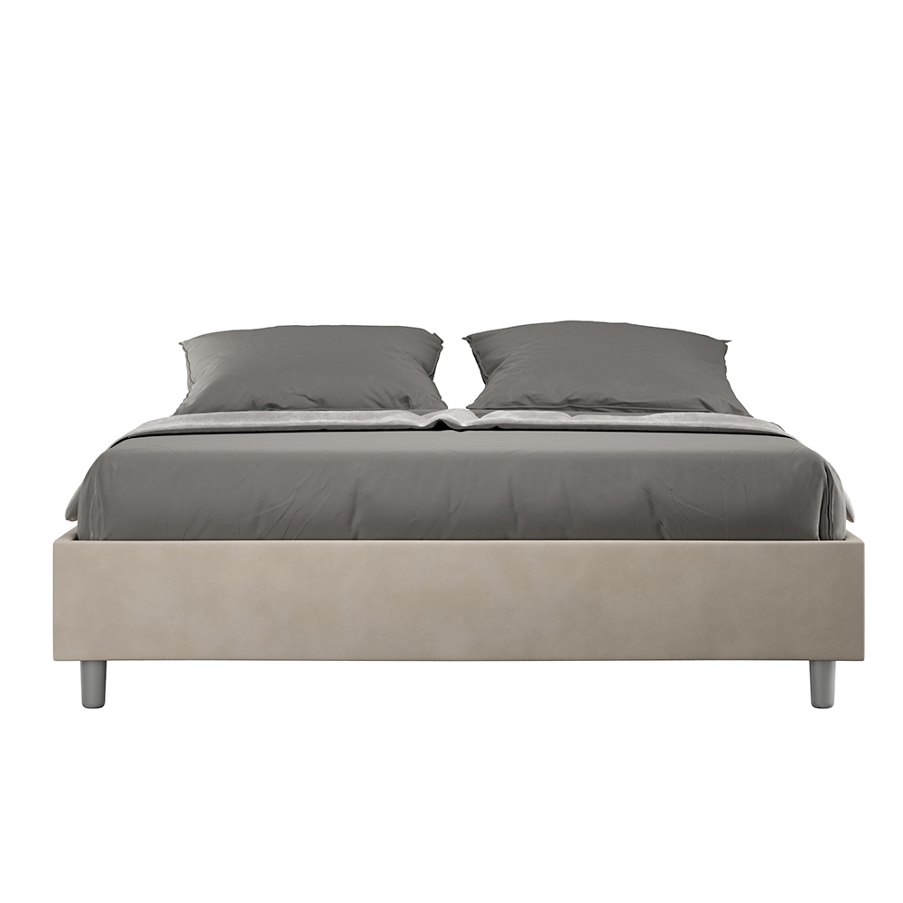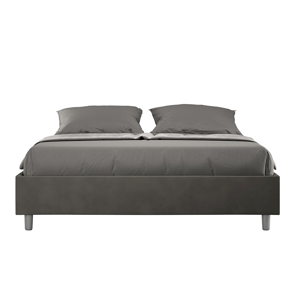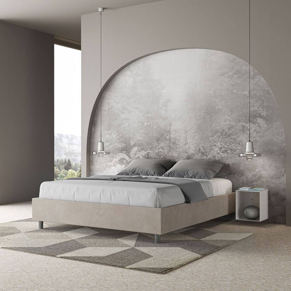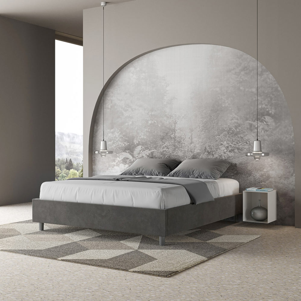 Cama de casal estofada de 160x200 cm, feita de painéis de aglomerado e revestida em microfibra , inteiramente fabricada na Itália. Esta cama de casal destaca-se pelo seu design minimalista e elegante . A sua estética discreta e versatilidade permitem que se integre facilmente em qualquer ambiente. Uma das suas características marcantes é a ausência de uma cabeceira tradicional , o que a torna ideal para ser colocada em espaços únicos, como debaixo de uma janela, num sótão ou perto de uma parede decorativa, sem obstruir a vista nem alcançar o efeito desejado.