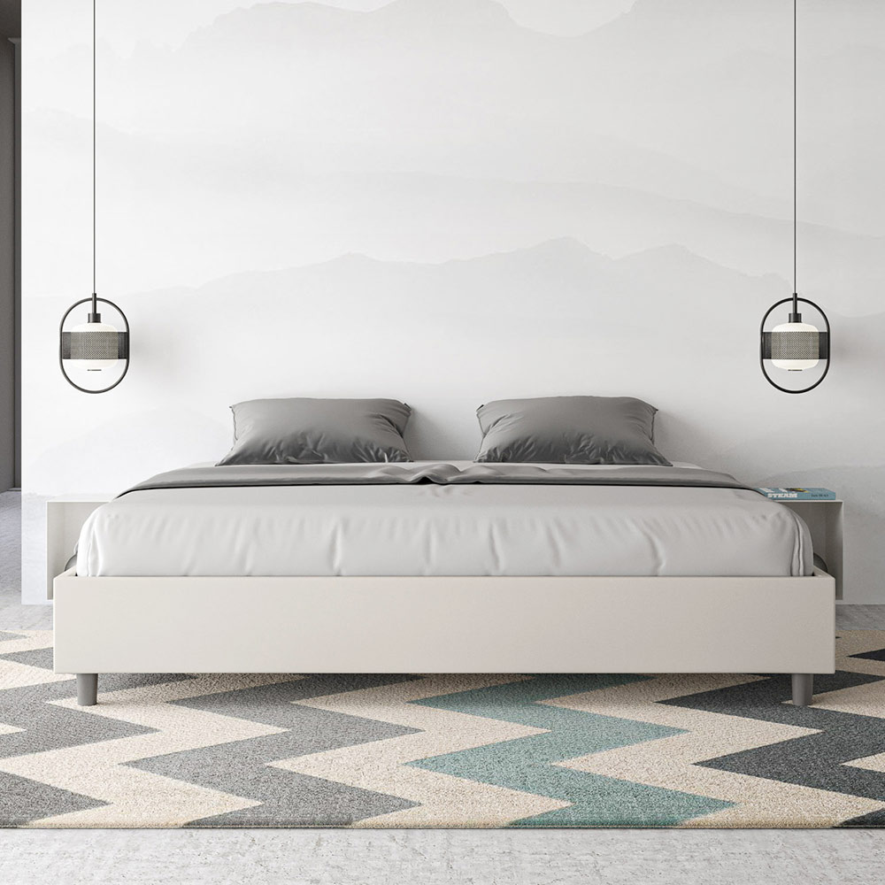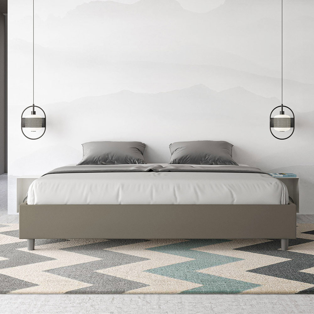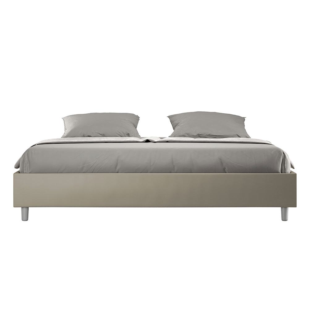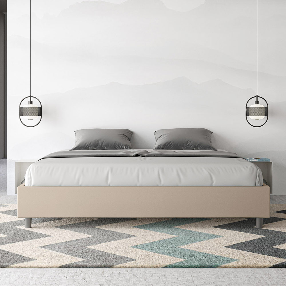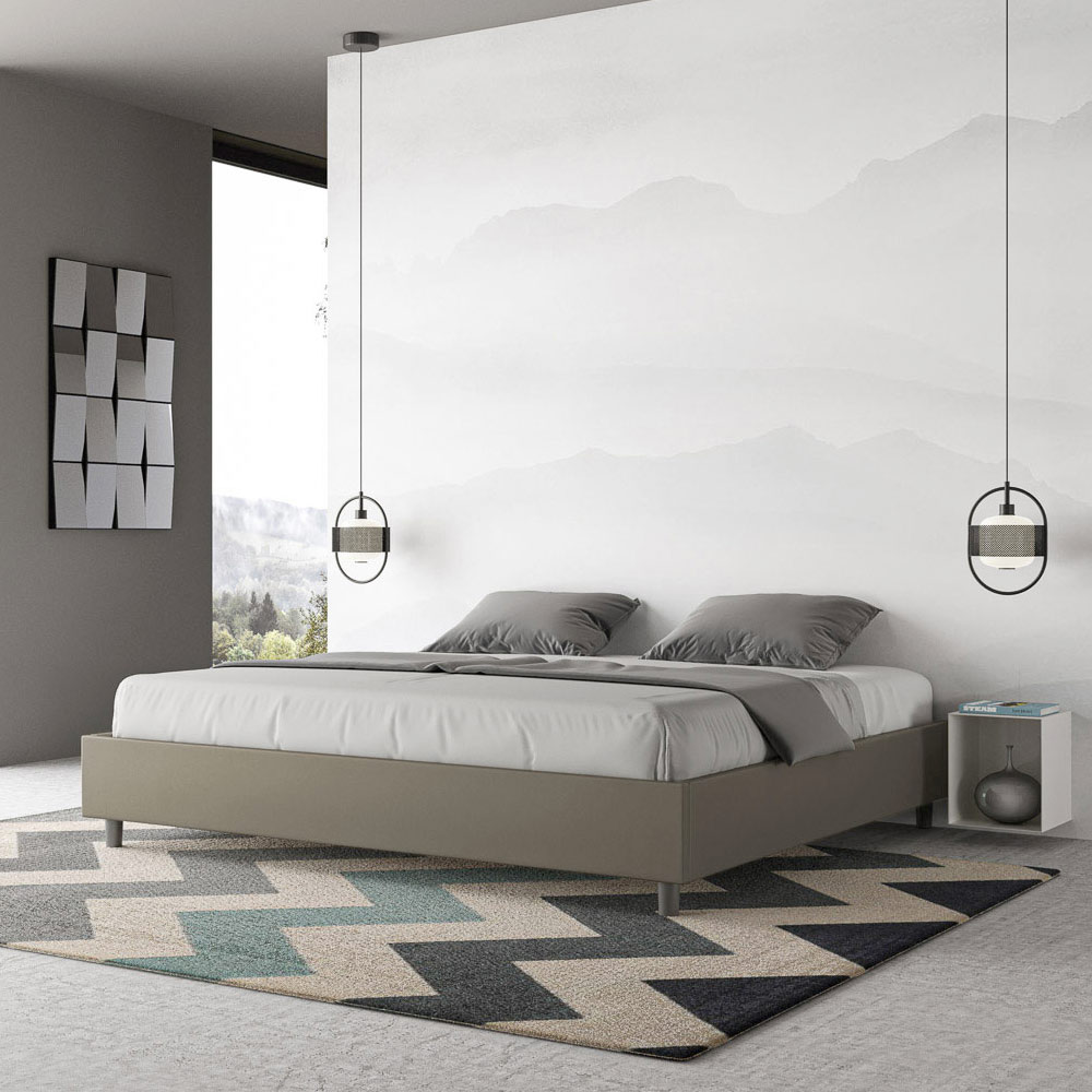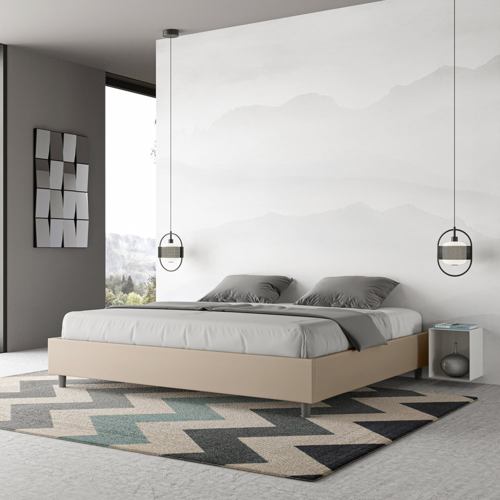 Cama king size 180x200 cm estofada, feita com painéis de melamina e revestida em imitação de couro , inteiramente fabricada na Itália. Esta cama king-size destaca-se pelo seu design minimalista e elegante . A sua estética discreta e versatilidade permitem que se integre facilmente em qualquer ambiente. Uma das suas características marcantes é a ausência de uma cabeceira tradicional , o que a torna ideal para ser colocada em espaços únicos, como debaixo de uma janela, num sótão ou perto de uma parede decorativa, sem obstruir a vista nem alcançar o efeito desejado.