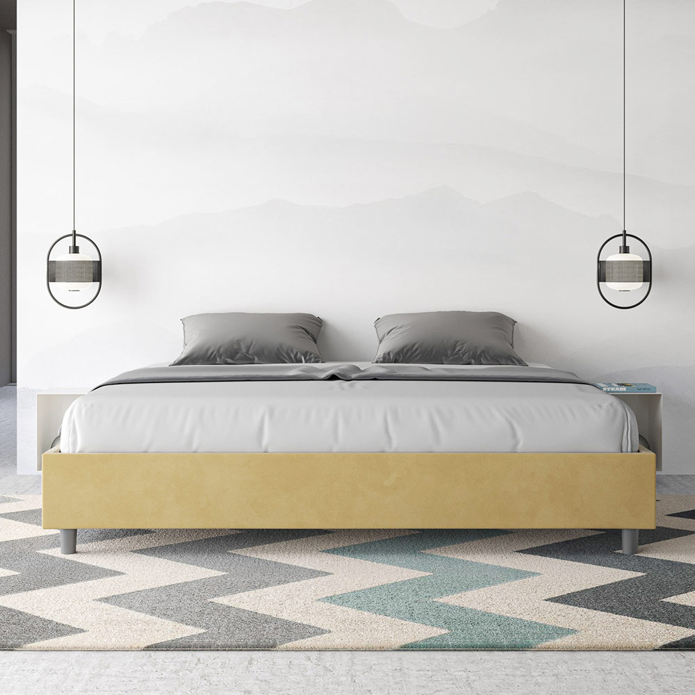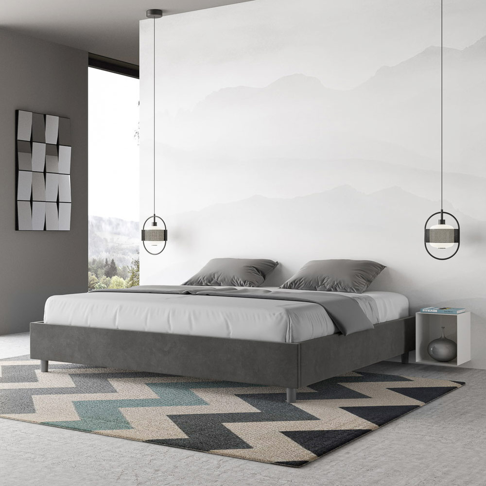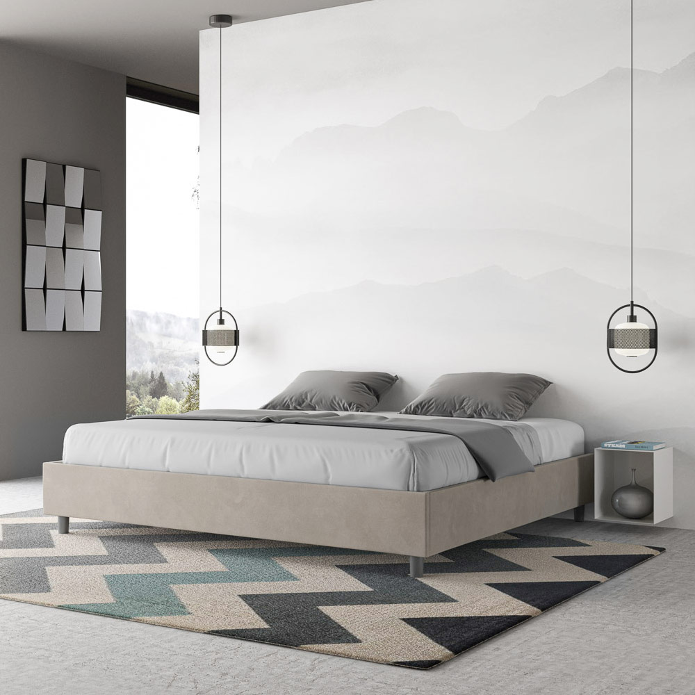 Cama king size 180x200 cm estofada, feita com painéis de melamina e revestida em microfibra , inteiramente fabricada na Itália. Esta cama king-size destaca-se pelo seu design minimalista e elegante . A sua estética discreta e versatilidade permitem que se integre facilmente em qualquer ambiente. Uma das suas características marcantes é a ausência de uma cabeceira tradicional , o que a torna ideal para ser colocada em espaços únicos, como debaixo de uma janela, num sótão ou perto de uma parede decorativa, sem obstruir a vista nem alcançar o efeito desejado.