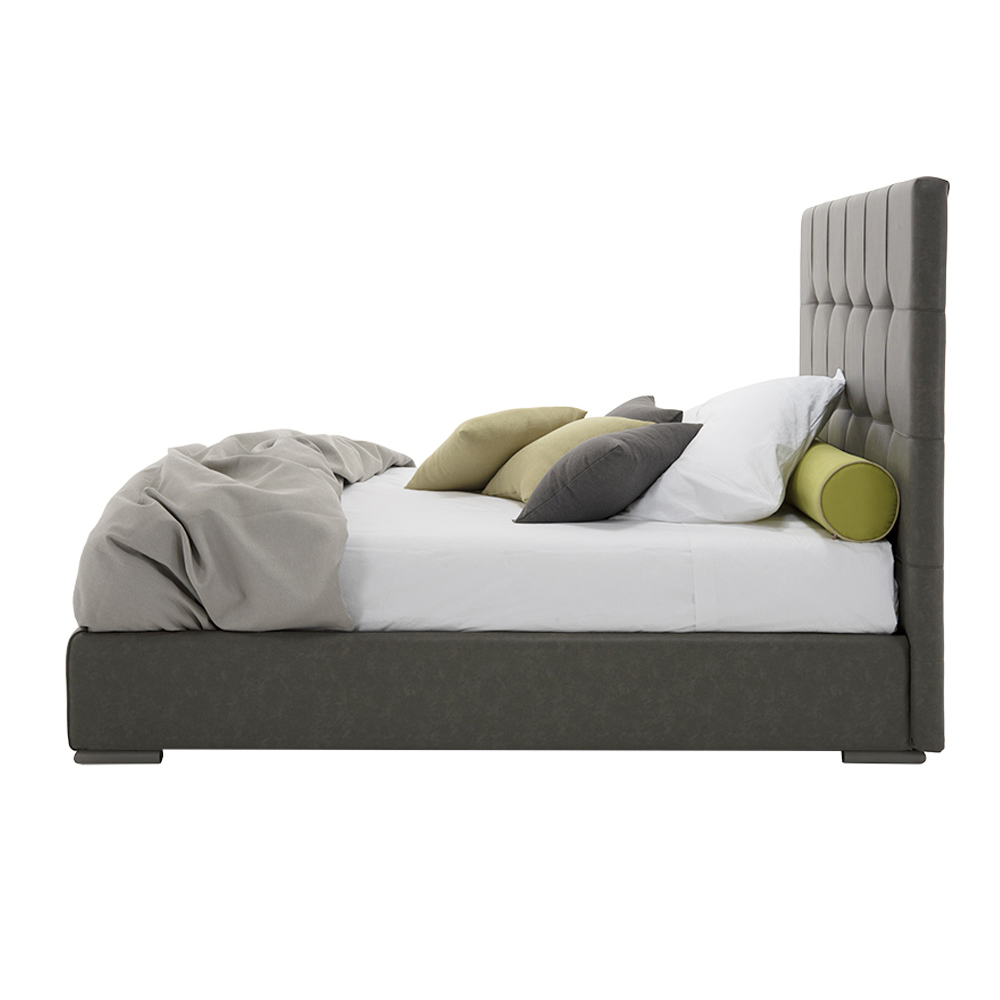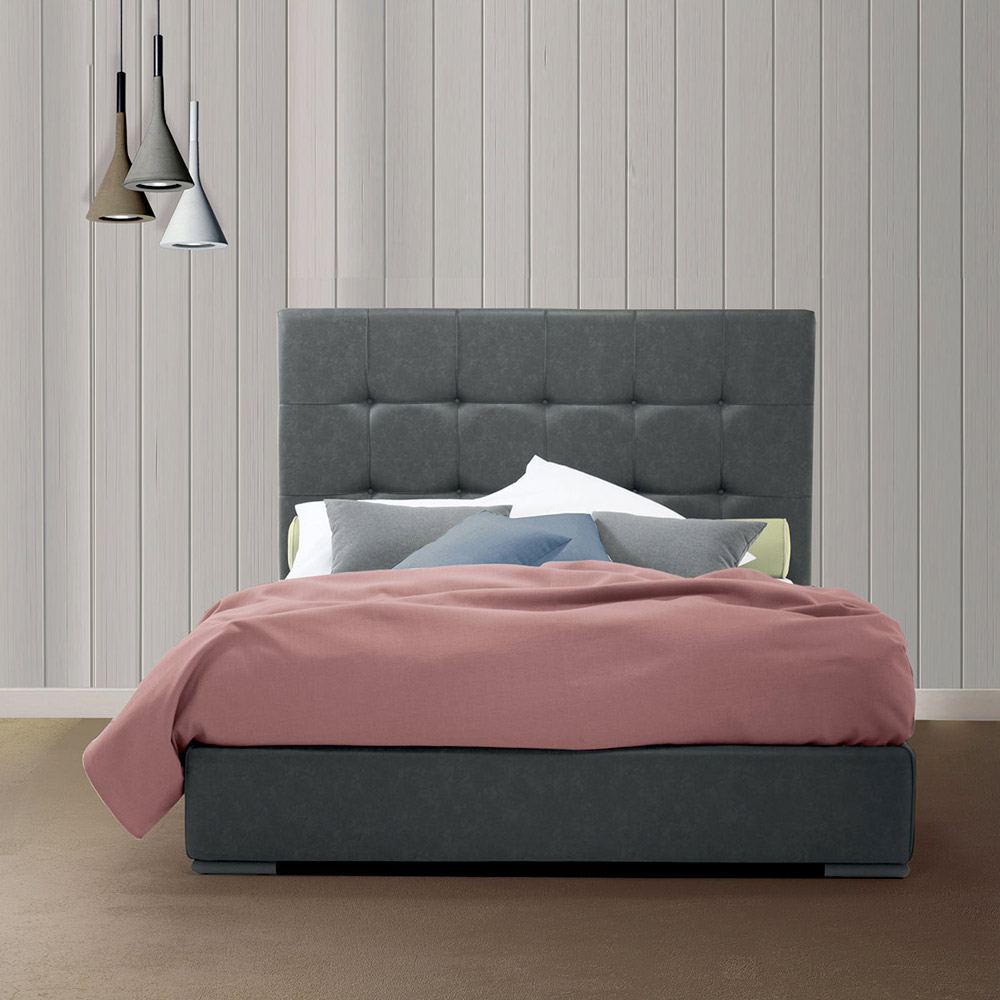 Cama de casal de alta qualidade com cabeceira king size e caixa de armazenamento, feita artesanalmente na Itália em tecido ou couro ecológico.
