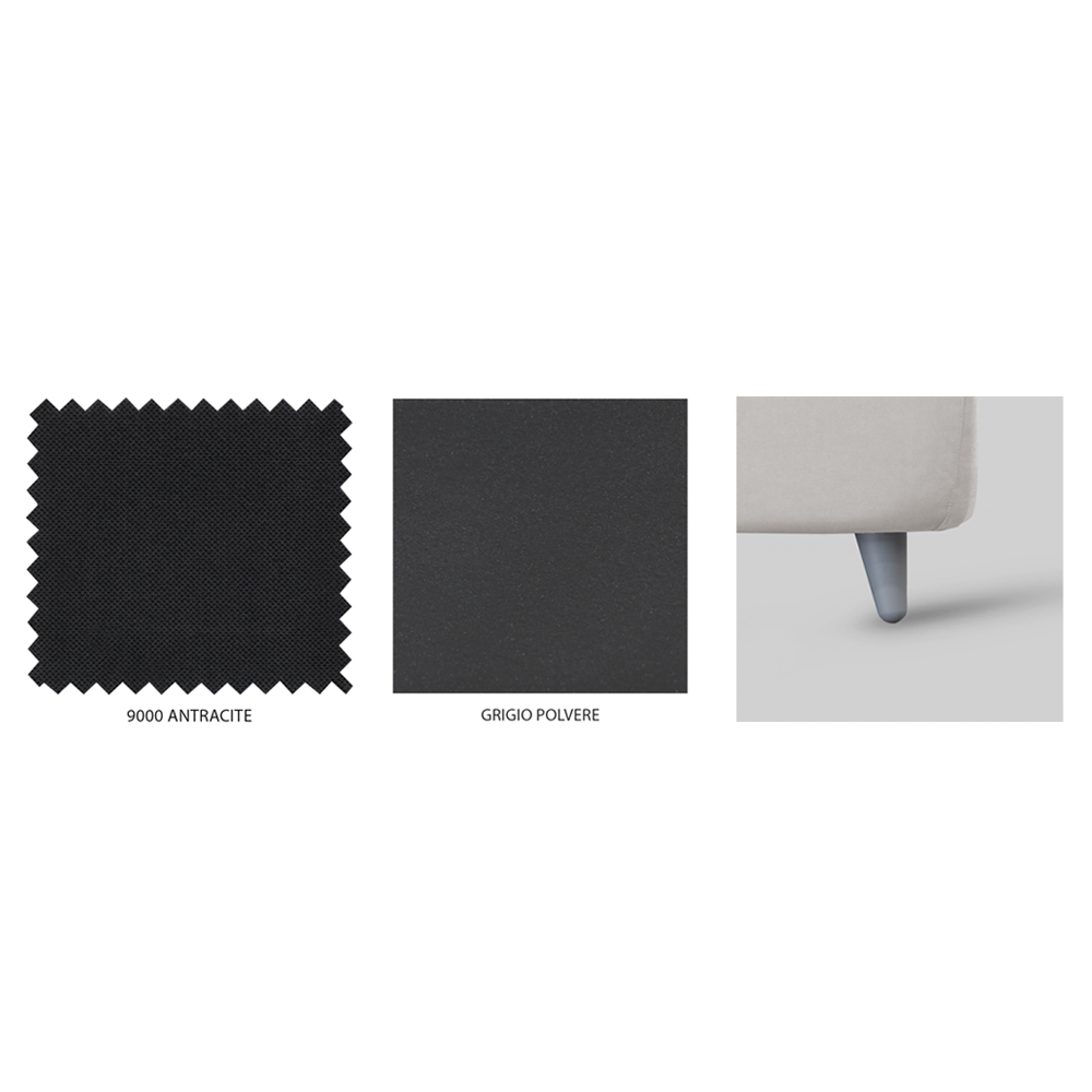 revestido em tecido na cor antracite com pés em polipropileno cinza.