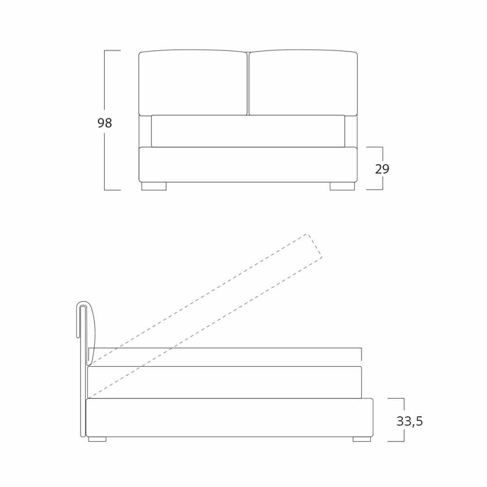 Estrutura em ripas de madeira de abeto com acabamento interno natural h.29 cm, revestida em espuma de poliuretano sem clorofluorcarbonetos segundo as normas UNI e forrada com velfodera estável à luz. Os fundos da estrutura são em aglomerado de madeira com acabamento interno sintético com efeito abeto, estes últimos são suportados por perfis de PE e tubulares. Base ripada com estrutura metálica, armação curva com perfil 50x37 mm pintada com pós epóxi. Base ripada ortopédica normal, ripas curvas de contraplacado de faia.