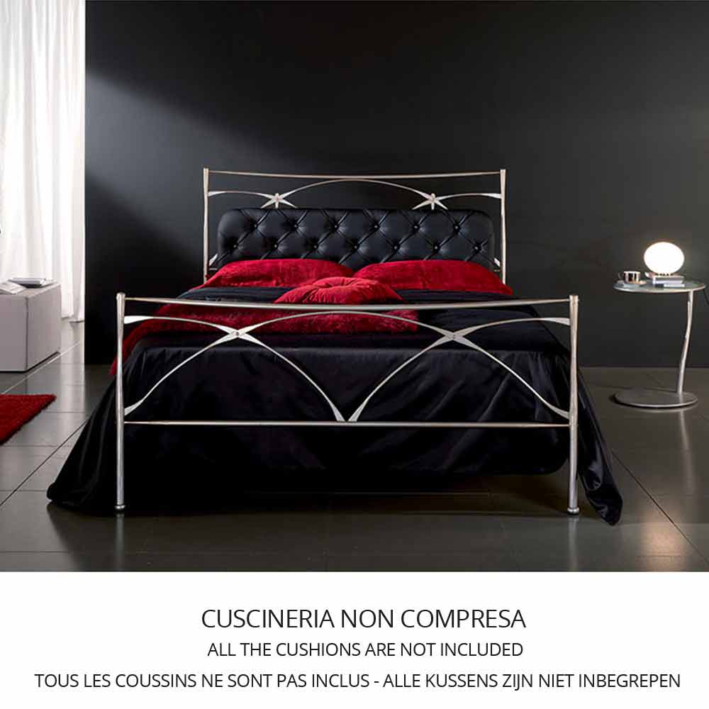 A cama de ferro forjado na variante CABECEIRA DUPLA COM FIXAÇÃO NA PAREDE requer a inserção de uma base de cama de 160 cm que deve ser suportada por suas próprias pernas. Caso haja necessidades particulares relacionadas à conformação física, à combinação com bases de cama existentes ou simplesmente à estética, este modelo, graças à nossa produtividade artesanal, pode ser modificado em altura e largura.