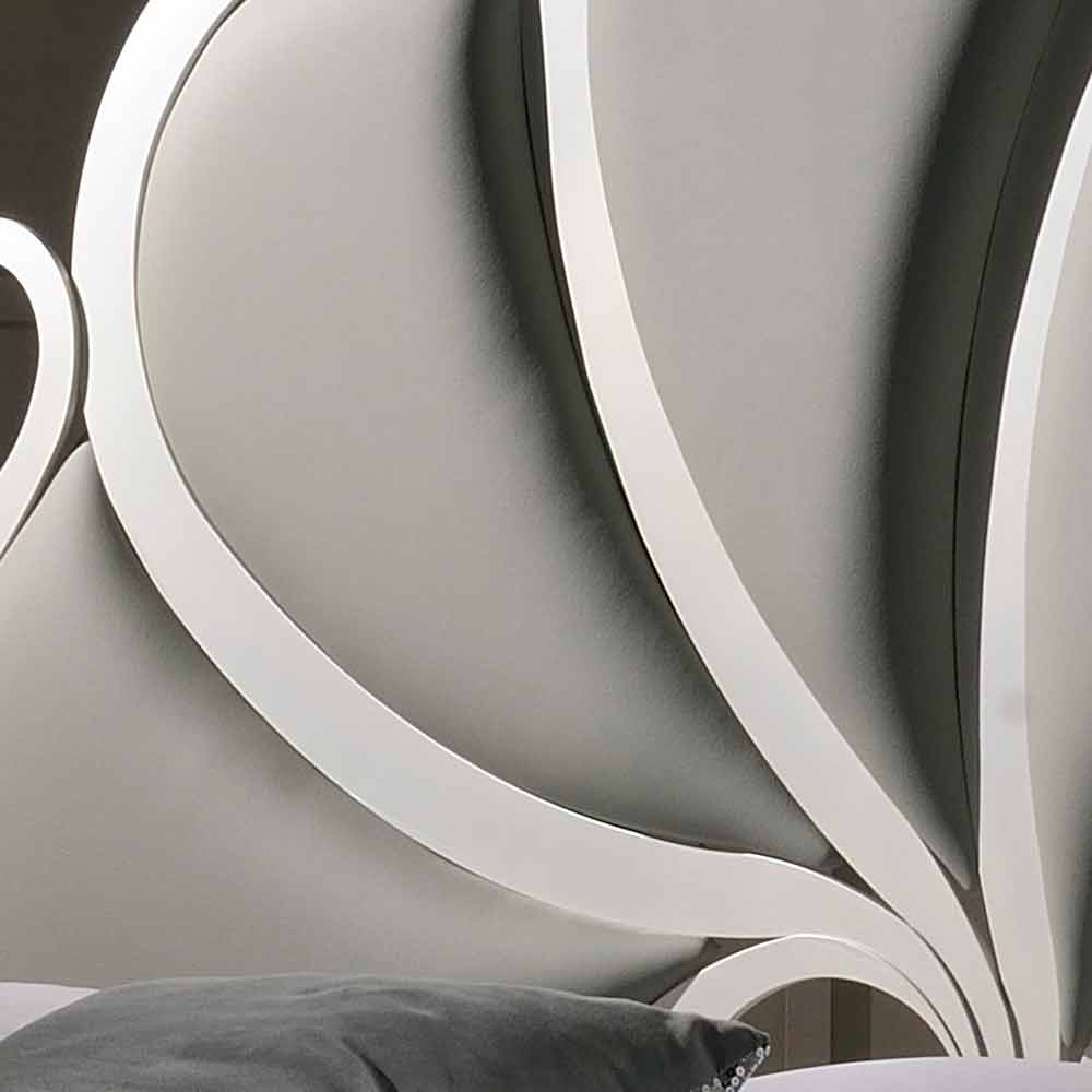 Esta cama é feita à mão na Itália por artesãos especializados e tem um acabamento em pérola. A cabeceira é acolchoada e coberta em couro sintético cinza e é embelezada por decorações de cristal.