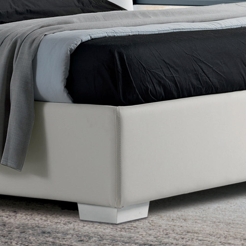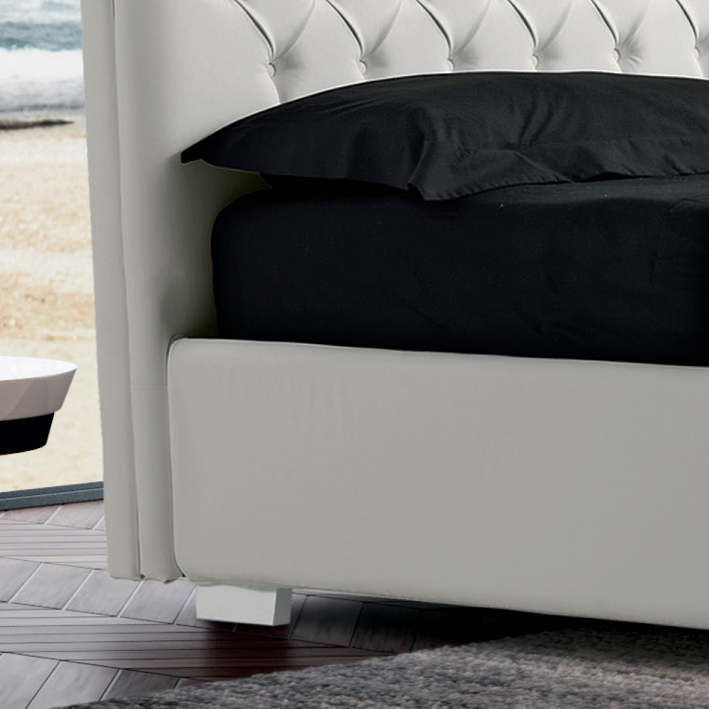 Cama de casal estofada revestida em couro ecológico, com caixa de arrumação, fabricada na Itália.