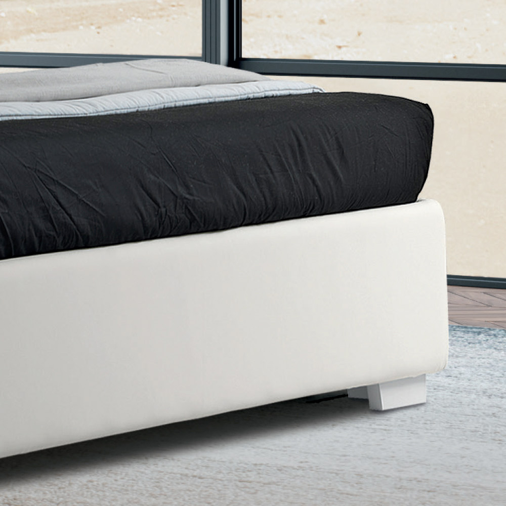 Esta cama está equipada com um grande recipiente com base elevatória , que é a solução ideal para otimizar o espaço, mantendo o quarto sempre arrumado. De fato, cobertores, roupas, travesseiros, etc. podem ser armazenados dentro da caixa. O recipiente está equipado com uma base elevatória ortopédica, feita de ferro tubular pintado com pós epóxi a 200° e tem duas barras de reforço de ferro verticais separadas e equidistantes. O tubular de metal mede 40x28 mm. As ripas são inteiras e feitas de compensado de bétula de 68x8 mm.