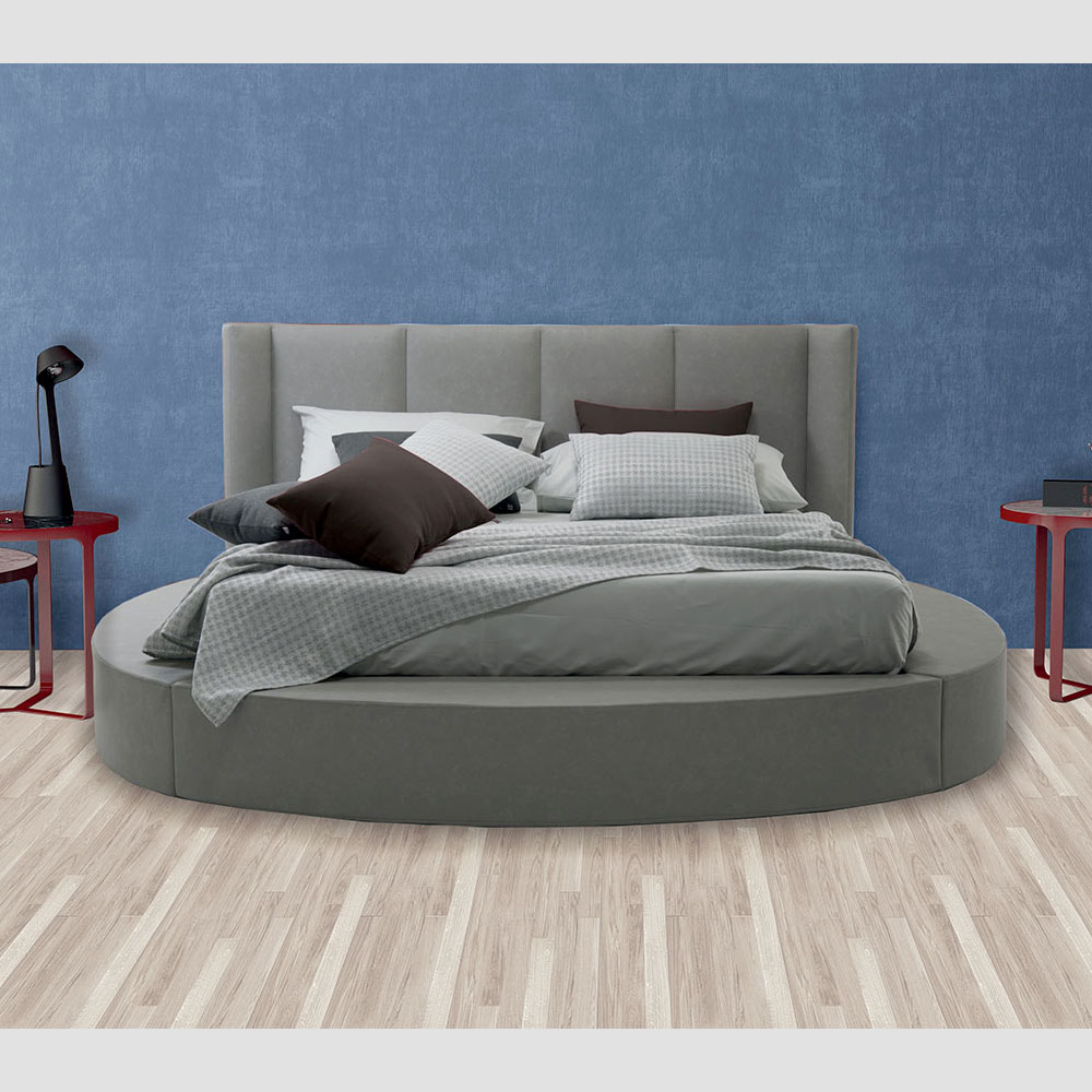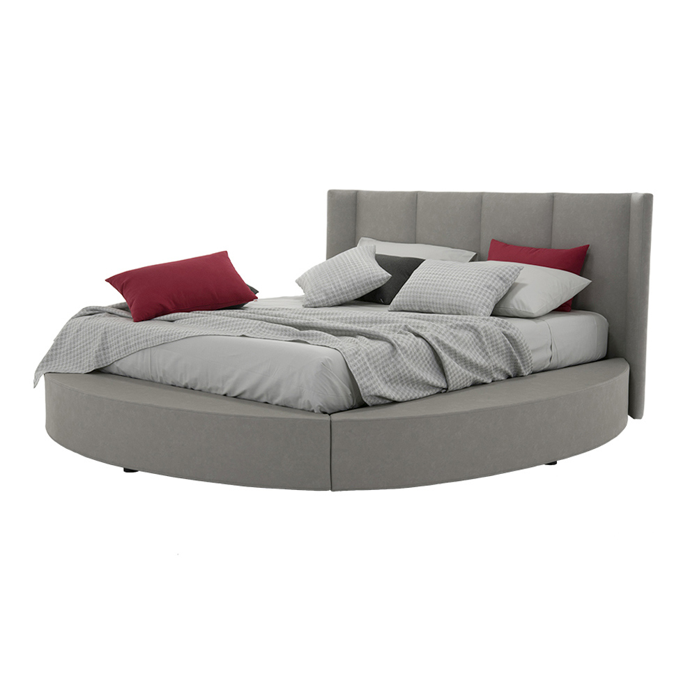 Cama de casal de alta qualidade com recipiente e estrado circular, em tecido ou couro ecológico, feito à mão na Itália.