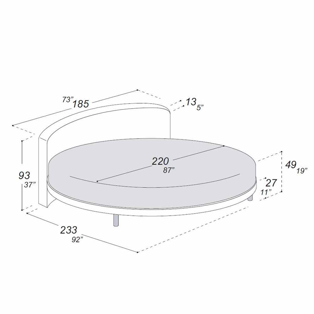 Cama de casal redonda com um design único e requintado, caracterizada por um formato inusitado e uma cabeceira arredondada que permite que seja utilizada no centro do ambiente, mas também encostada à parede.