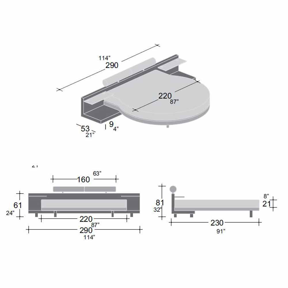Cama de casal redonda com design único e refinado caracterizada pela cabeceira equipada que torna a cama ainda mais prática e funcional, incluindo um banco de madeira maciça e compensado acolchoado com espuma de poliuretano revestida com enchimento de poliéster e/ou veludo acoplado. Também na cabeceira há duas