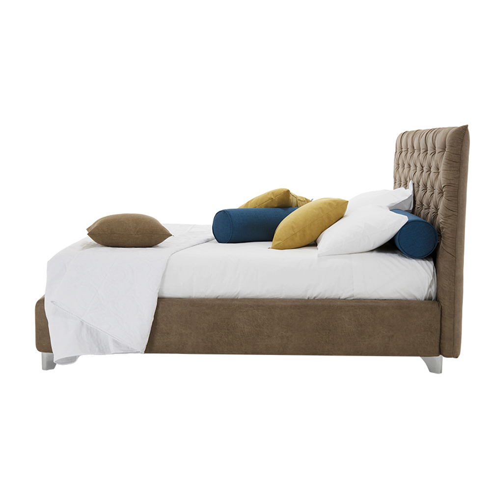 Cama de casal de luxo estofada em tecido ou couro ecológico, feita à mão na Itália com caixa de armazenamento.