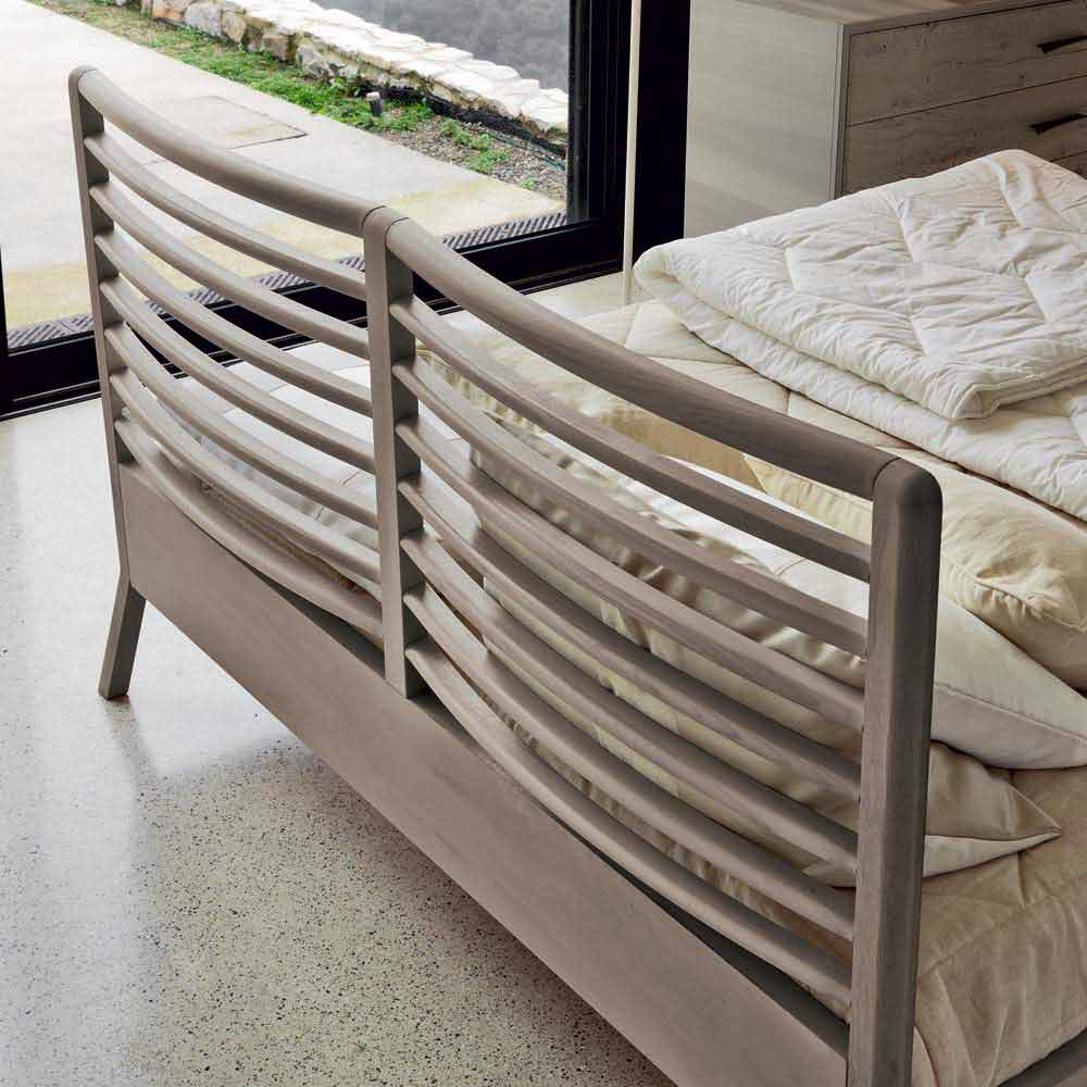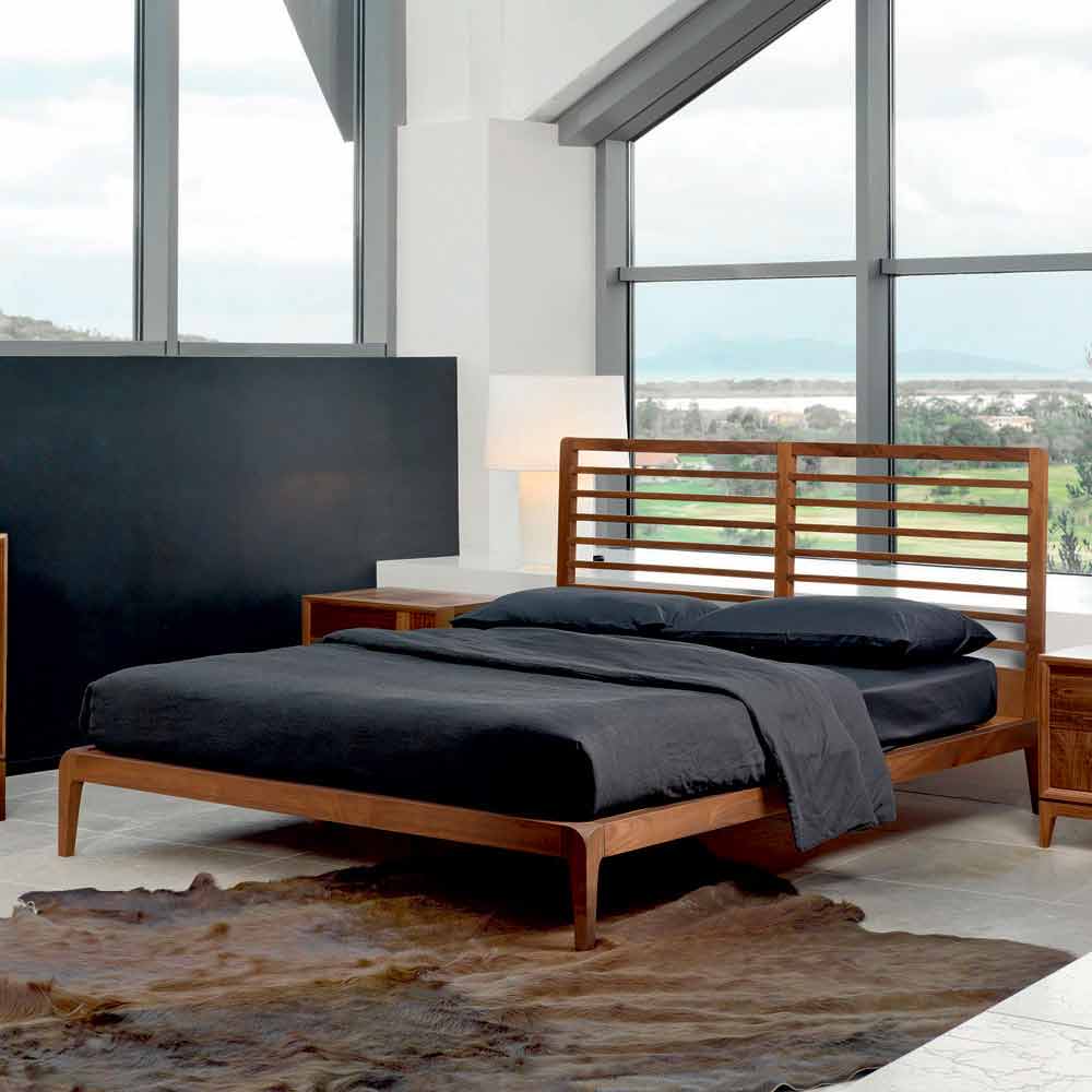 Nesta solução, a cama mais harmoniosa oferece uma cabeceira acolchoada, embelezada com costuras que traçam linhas verticais. Essencial e elegante, é feito de nogueira sólida com acabamento a óleo, para ser inserido nos contextos de mobiliário mais refinados.
