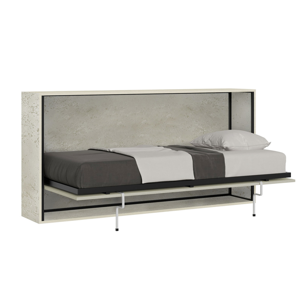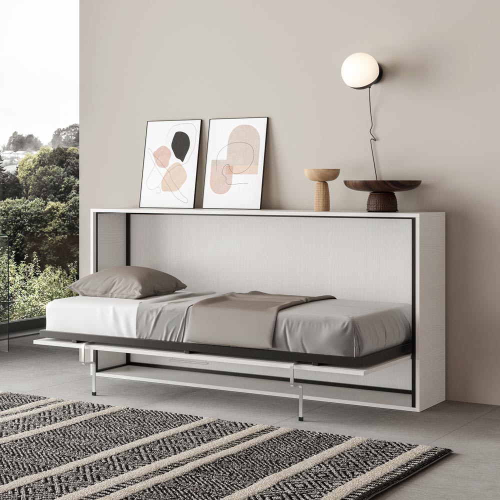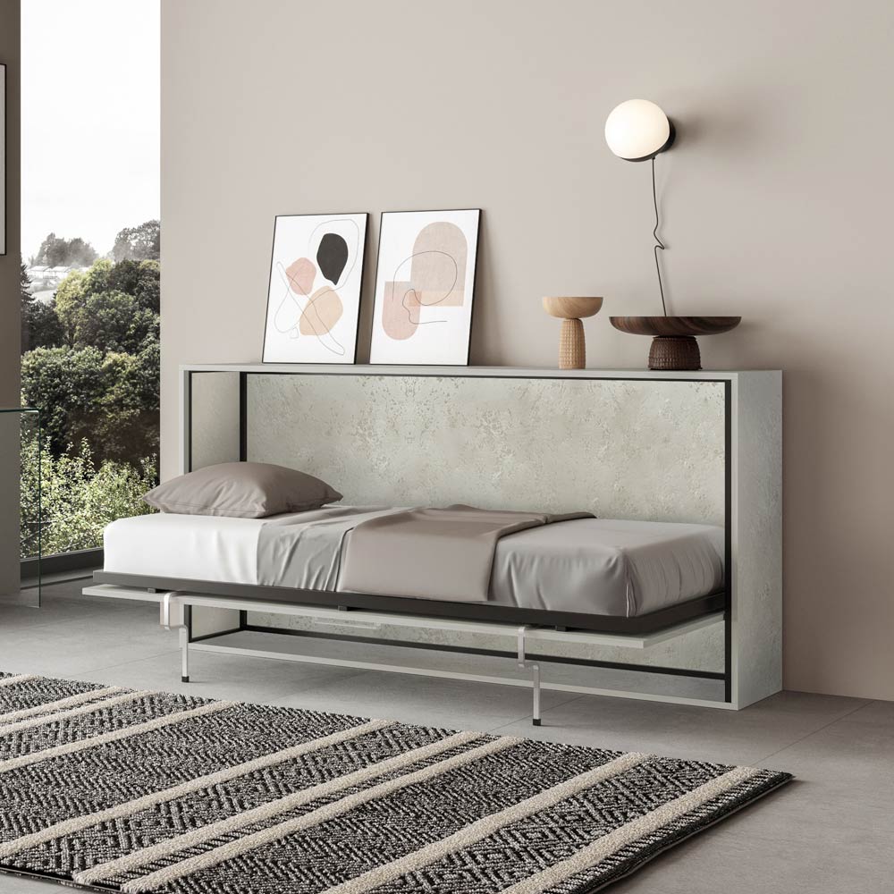 Cama horizontal dobrável realizada com estrutura em painéis de partículas de madeira enobrecidas de 18 mm de espessura, base da cama em ferro reforçado com pintura a pó epóxi na cor alumínio gofrado.